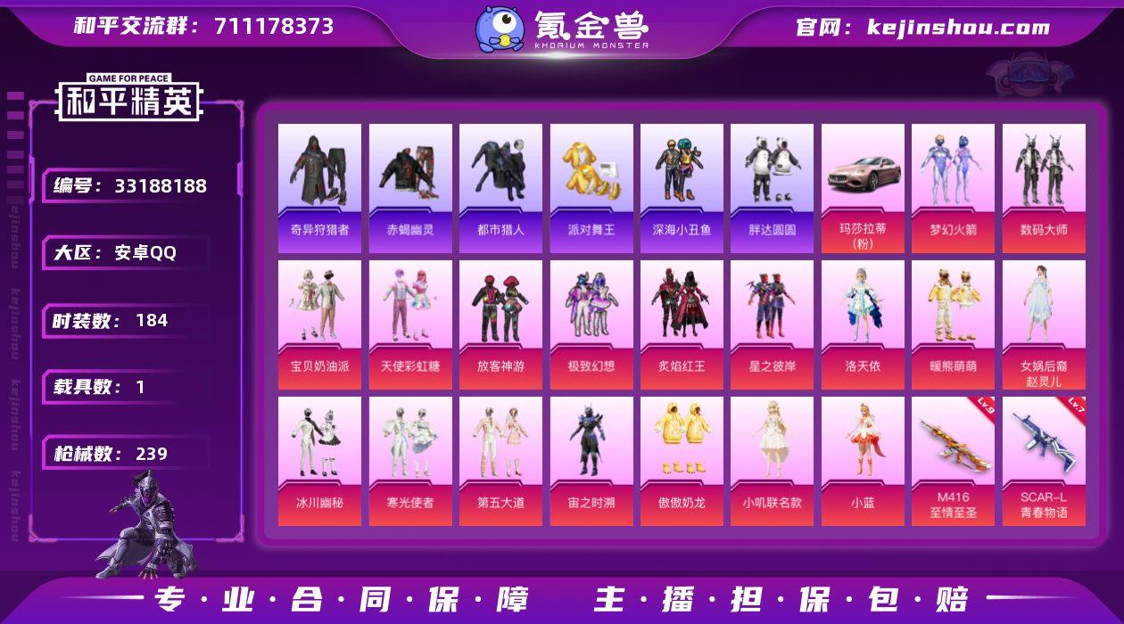 A2023安卓 手Q-18粉装-9特效枪-1载具-3粉色飞行器-80909热力值-17王牌印记-184套装-239枪皮 【热门品类】:粉装-梦幻火箭,套装-浪漫天命,套装-赤蝎幽灵,套装-都市猎人,套装-派对舞王,套装-深海小丑鱼,套装-小丑鱼,套装-奇异狩猎者,角色-军刀雅典娜,套装-胖达圆圆,套装-龟仙人,套装-潮萌小黄鸭,套装-粉红小猪,角色-Mark.06,大砍刀-青龙偃月刀 【粉色套装】:粉装-数码大师,粉装-宝贝奶油派,粉装-天使彩虹糖,粉装-梦幻火箭,粉装-放客神游,粉装-极致幻想,粉装-炙焰红王,粉装-星之彼岸,角色-洛天依,粉装-暖熊萌萌,女娲后裔-赵灵儿,粉装-冰川幽秘,粉装-寒光使者,粉装-第五大道,角色-宙之时溯,粉装-傲傲奶龙,角色-小叽联名款,角色-小蓝 【粉色枪皮等级】:SCAR-L-青春物语(七级),M416-至情至圣(九级),AUG-星之彼岸(五级),AKS-74U-森灵之息(五级),Kar98K-巳巳如意(五级),Mk14-福马献瑞(四级),AA12-G-萌骑幻想(四级),DP-28-豹影疾电(五级),MG-36-沧焰双生(五级) 【粉色载具】:玛莎拉蒂Ghibli(粉) 【粉色枪皮】:SCAR-L-青春物语,M416-至情至圣,AUG-星之彼岸,AKS-74U-森灵之息,Kar98K-巳巳如意,Mk14-福马献瑞,AA12-G-萌骑幻想,DP-28-...