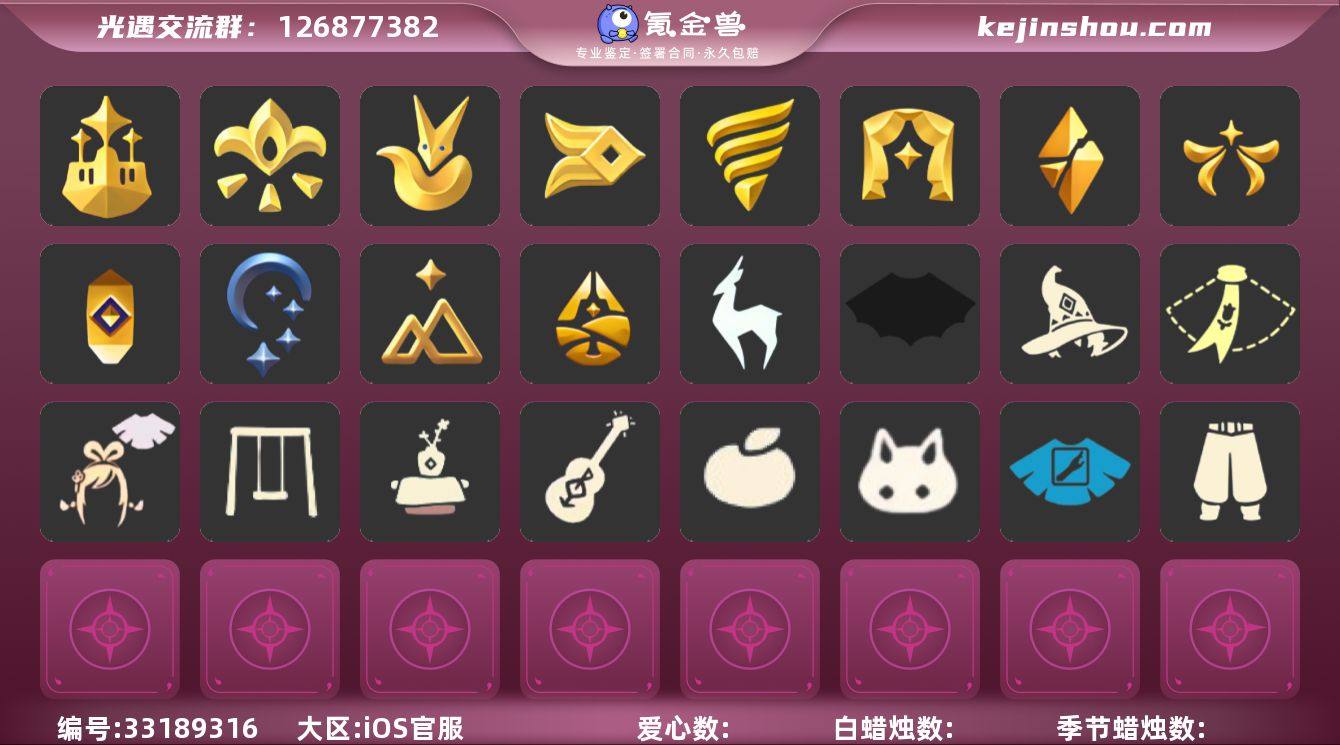 账号类型: 手机账号 季节已毕业: 梦想季,小王子季,风行季,潜海季,表演季,破晓季,欧若拉季,集结季,夜行季,追忆季,拾光季,归巢季,九色鹿季 完成地图: 晨岛,云野,雨林,霞谷,暮土,禁阁,全图毕业 礼包: 蝙蝠套,巫师,围巾,绊爱,秋千,茶桌,吉他,橘子,兔子,tgc 裤子: 武士裤