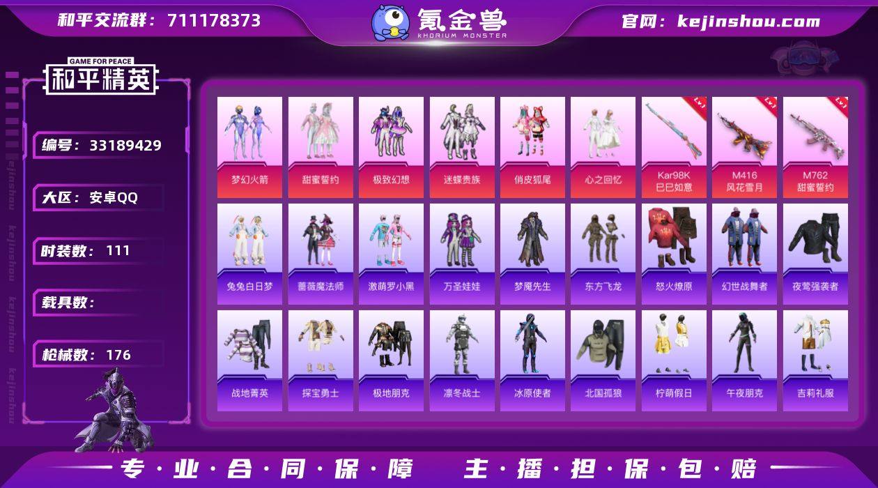 XQ1239+【梦幻火箭 极致幻想 甜蜜誓约 迷蝶贵族 俏皮狐尾 心之回忆 M416-风花雪月七级 M762-甜蜜誓约七级 M416-仓鼠灰灰 激萌罗小黑 兔兔白日梦 浪漫天命 雪山精英 2太阳 可二次】安卓Q区-6粉装-3特效枪-56222热力值-5王牌印记-140套装-176枪皮【优质套装】: 梦幻火箭 极致幻想 甜蜜誓约 迷蝶贵族 俏皮狐尾 心之回忆【特效枪等级】:Kar98K-巳巳如意(一级- Kar98K-巳巳如意)M416-风花雪月(七级- M416-风花雪月)M762-甜蜜誓约(七级- M762-甜蜜誓约)【优质武器皮肤】: Kar98K-巳巳如意 M416-风花雪月 M762-甜蜜誓约【稀有武器皮肤】: Kar98K-巳巳如意 Mk14-冰河战士 M416-风花雪月 M762-甜蜜誓约 M416-红色方程式 M416-仓鼠灰灰 M416-乌木金纹 M416-蓝色火焰 M416-糯团青竹 AKM-夜灯 AKM-四圣焕新 AKM-生命誓言 AKM-乌木金纹 AKM-彩虹符号 AKM-春暖花开 AKM-冰凉西瓜 AKM-龙的传人 AKM-灼热熔岩 AKM-虎虎生威 AKM-萌趣颜团子 AKM-霓虹街区 SCAR-L-红色方程式 SCAR-L-玉兔迎春 SCAR-L-乌木金纹 SCAR-L-甜蜜誓约 SCAR-L-金风玉露 SCAR-L-炫彩节奏 SCAR-L-生命誓言 M16A4-红色方程式 M16A4-蓝色火焰 M16A4-甜心亚梦 M16A4-乌木金纹 M16A4-生命誓言【其他套装】: 梦幻火箭 极致...