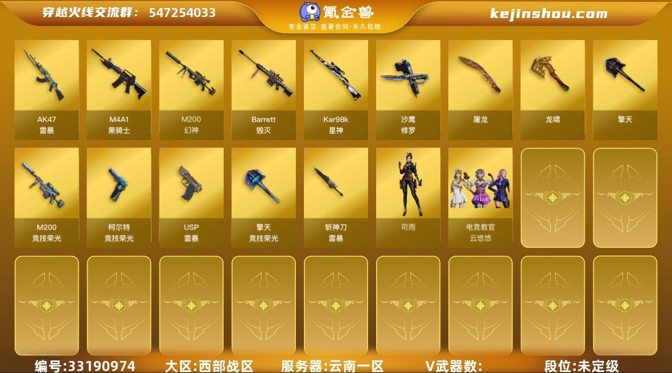 9638/西部/云南一区/可排位/【Lv.100 高阶大元帅】VIP4/83V/幻神/幻神星耀/星神/星神音效卡/M200竞技荣光套/王者凌虎/朱雀电竞之星/雷暴套/3修罗/USP雷暴/*2/八套竞技荣光手雷/五套雷暴手雷/【皮肤音效卡】/毁灭英雄计划/毁灭虹光风暴/雷神神秘按键/炼狱百战金芒庆典舞曲音效卡/白虎盛典舞曲音效卡/【2个四防角色】/电竞教官云悠悠/星际战将/【其他角色】/职业选手/葵阿尔法武装/修道士/乔伊教练/灵狐者黄金海岸/【玩偶武器】/斯太尔蝴蝶/火麒麟零纪元/裁决雪莉杨///各种饰品、道具/细节看图/【账号封过十年已解】