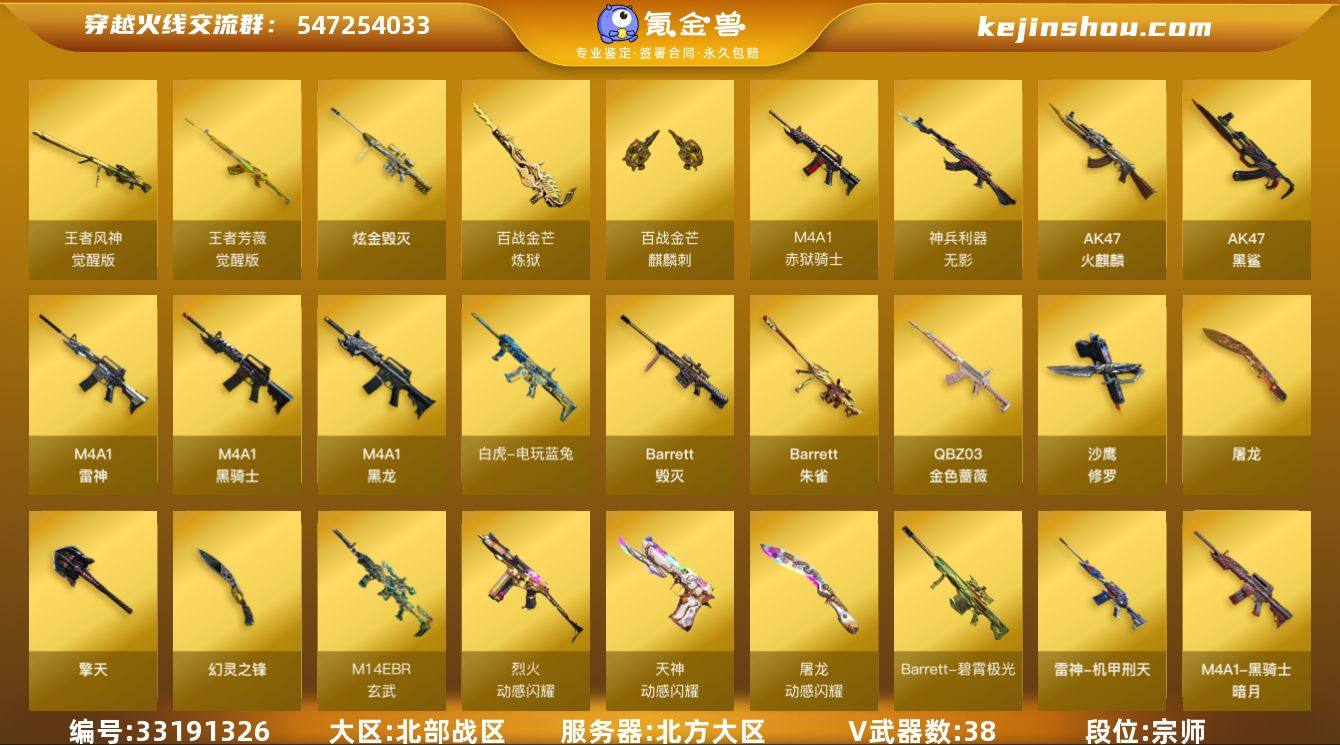 北方大区-42V-4王者武器数-2炫金武器数 【热门武器】:QBZ03-金色蔷薇,M14EBR-玄武,M4A1-青龙,白虎-电玩蓝兔,金色小号,C.A.T,毒蜂,M4A1-黑骑士,羊驼玩偶,沙鹰-修罗*2 【王者炫金武器】:王者冰锋,炫金毁灭*2 【音效卡】:M4A1-苍鸣雷神音效卡,M4A1-赤狱骑士-怀旧音效卡,Barrett-碧霄极光音效卡,炼狱-百战金芒-庆典舞曲音效卡,柯尔特-百战金芒-庆典舞曲音效卡 【皮肤】:幻神-动感闪耀 皮肤,雷神-机甲刑天皮肤,雷神-源计划2.0专属 皮肤,M4A1-再燃火线,毁灭-虹光风暴 皮肤,黑骑士-暗月*2,修罗-CF STAR,轻型军用手斧-再燃火线 【角色】:电竞教官-云悠悠,王者潘多拉,乔伊教练,云海玲珑,暗夜-X,电竞少女,风暴女,虎妞,嘉年华灵狐,娟娟,兰-海滩派对,兰妹妹,猎狐者-追月,灵狐-花神,灵狐者-X,灵狐者-七夕宝贝,曼陀罗-X,女战神,蛇姬,斯沃特-X,兔囡囡,樱-战斗天使 【人偶武器】:迷你宝贝,M200-曼陀罗,AWM-灵狐-15周年嘉年华,C.A.T,迷你牛魔王,迷你波特博士*2,夺魂,迷你牛牛,生化手雷-机甲核心,深渊终结者手雷*2,迷你艾比,灵狐娃娃手雷 【暴走生化】:毒蜂,超级对讲机 【挑战大师】:冰龙粉碎者-白马银枪,激光毁灭者III-白马银...