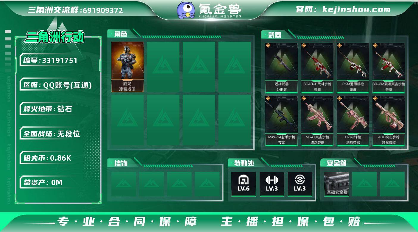 实名: 不可修改 烽火地带段位: 钻石 全面战场段位: 无段位 总资产: 26 哈夫币: 868 干员外观: 威龙-凌霄戍卫 传说武器皮肤: 近战-处刑者,M14射手步枪-蛮荒,QBZ95-1突击步枪-凌霄戍卫,K416突击步枪-行动记录,SCAR-H战斗步枪-荼蘼,PKM通用机枪-荼蘼,SR-3M紧凑突击步枪-荼蘼,Mini-14射手步枪-夜莺,SMG-45冲锋枪-锦绣,K437突击步枪-锦绣,AKM突击步枪-锦绣,MK47突击步枪-悠然茶歇,AUG突击步枪-悠然茶歇,UZI冲锋枪-悠然茶歇