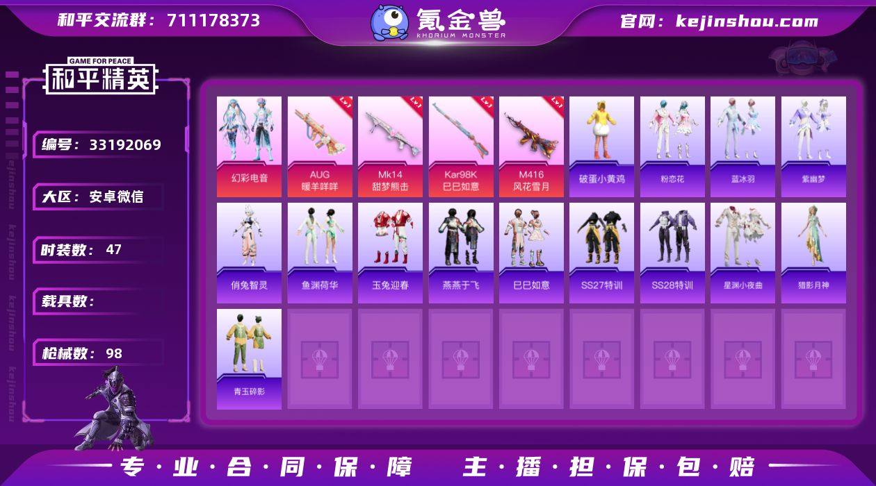 安卓 微信-1粉装-5特效枪-0载具-1粉色飞行器-27218热力值-5王牌印记-47套装-98枪皮 【粉色套装】:粉装-幻彩电音 【粉色枪皮等级】:M416-风花雪月(七级),AUG-暖羊咩咩(五级),ACE32-萌骑漫游(五级),Kar98K-巳巳如意(五级),Mk14-甜梦熊击(五级) 【粉色枪皮】:M416-风花雪月,AUG-暖羊咩咩,ACE32-萌骑漫游,Kar98K-巳巳如意,Mk14-甜梦熊击 【粉色飞行器】:炫彩糖果飞行器 【粉色降落伞】:洛神天依降落伞,风花雪月降落伞,智耀战神降落伞,幻彩电音降落伞,冷漠罗丽降落伞,极意拳锋降落伞,炫彩糖果降落伞,镜花水月降落伞 【稀有套装】:套装-巳巳如意,套装-雪国风尚,套装-炫彩糖果,角色-俏兔智灵,套装-燕燕于飞,套装-鱼渊荷华,套装-粉恋花,套装-紫幽梦,套装-蓝冰羽,角色-猎影月神,套装-星渊小夜曲,套装-霓虹热舞,套装-彩虹兔,套装-云朵鹅,套装-雪绒豹,套装-书海巡游,套装-画境星梦,套装-琴音绮想 【稀有枪皮】:AUG-冰晶雪宝,M16A4-幻世战舞者,SCAR-L-夜灯,SCAR-L-炫彩节奏,M416-红色方程式,M416-蓝色火焰,QBZ-彩虹符号,M762-云朵鹅,Mk47-洛神天依,G36C-星穹咏叹调,AC-VAL-天降萌叽,蜜獾-天降萌叽,ACE32-画境星梦,UZI-啾咪啾咪,UZI-...