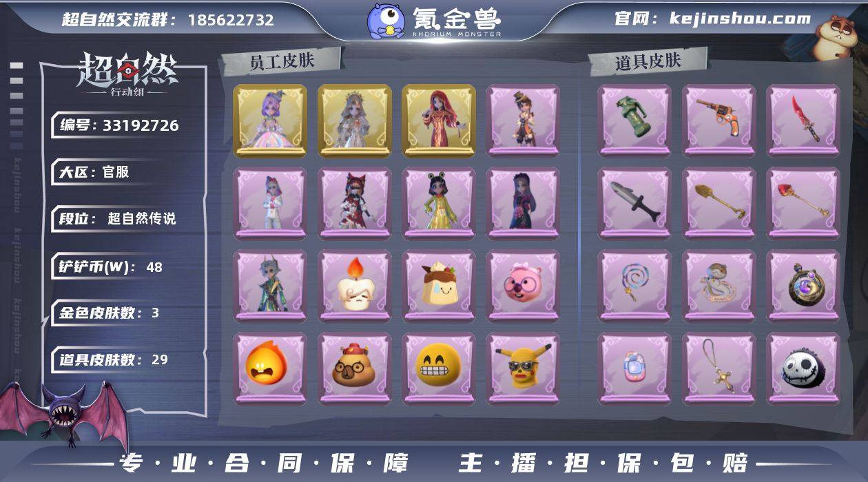 ZR537,金皮:3,紫皮:6,道具皮:29,外观:薇薇安-圣光之谕,小黄-遗失的童话,巫铃儿-镜花辞,阿念-庆宴绮愿,艾伦-绒绒对决,莉莉-莓果陷阱,逍遥-泽引山海,爱丽丝-丝缕哀歌,小黄-呱呱雨衣,道具:腰包-宝剑八,闪光弹-金戈玄铜,黄牛能量饮料-青玉抱丹,长鞭-飞天绫,音响-鸣沙鼓,转轮手枪-新星时代,腰包-惊魂娃娃,刺刀-小鲨匕首,摸金符-祝祷词,音响-happy猫,铲子-圣心之泪,黄牛能量饮料-珍珠芭乐莓莓,铲子-龙鳞,传送按钮-逆时审判,长鞭-小狗蛇点点鞭,额外的背包-飞花令,传送按钮-幻宠之门,刺刀-赤色之刃,急救包-蔷薇物语,专业手电-云端梦想计划,夜视仪-金丝眼镜,背饰-潮汐小海兔,背饰-兔先生的时钟,背饰-云梦之星,背饰-天使的呼唤,背饰-蝶恋花,员工:小满,临云,小黄,爱丽丝,零,阿念,逍遥,薇薇安,巫铃儿,莉莉,艾伦,爱德华,兰,动作:金城舞,luvaboy,鸳鸯戏,DL摇,鹏友摇,心跳摇,伤心摇,小雨摇,舞台中心,带你逃跑吧,举牌,抬手,头饰:腊肠扭扭,烛光纪念,蒜了八,樱桃奶油布丁,惊魂南瓜头套,精致露比头套,小财神豚豚头套,鱼头怪头套,烈焰红唇头套,大葱明头套,火爆了头套,面具马头套,哈士奇头套,萨卡班甲鱼头套,嘻嘻头套,滑稽头套,呆滞头套,卑微头套,鳄霸天头套,驼半仙头套,小狗蛇点点头套,炙热烧烤,粽...