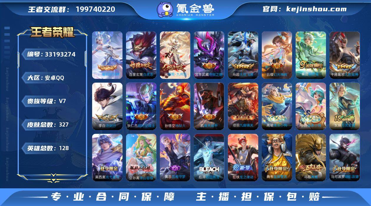 安卓Q-V7-永恒钻石IV段位-128英雄-327皮肤-1典藏皮肤-14传说-93史诗【英雄全皮】:孙权全皮,狂铁全皮,猪八戒全皮,敖隐全皮,蒙恬全皮【荣耀典藏】:伽罗最初的交响【传说皮肤】:关羽神骥镇沧海,马超神骥逐星野,花木兰异界灵契,澜愿照九州拓,云缨幻光神枪,桑启鸣野蒿,李白诗剑行,马超无双飞将,铠绛天战甲,干将莫邪久胜战神,百里玄策白虎志,宫本武藏地狱之眼,孙悟空地狱火,狄仁杰超时空战士【限定皮肤】:白起狰,大乔绒语心约,姜子牙天穹之誓,狄仁杰阴阳师,虞姬凯尔特女王,赵云皇家上将,嬴政白昼王子,孙尚香蔷薇恋人,庄周高山流水,高渐离死亡摇滚,钟无艳王者之锤,钟无艳超时空战士,白起夜都怪侠,芈月重明,吕布猎兽之王,元歌云间偶戏,元歌无心,甄姬落雪兰心,曹操烛龙,典韦穷奇,典韦蓝屏警告,马可波罗逐梦之星,马可波罗暗影游猎,马可波罗山海玄木吟,狄仁杰魔术师,狄仁杰万华元夜,达摩沙漠行僧,项羽海滩派对,老夫子醍醐杖,程咬金演武夺筹,王昭君午后时光,兰陵王金庭之子,亚瑟潮玩骑士王,孙悟空大圣娶亲,牛魔御旌,后羿辉光之辰,后羿圣弓游侠,李元芳云中旅人,钟馗神迹守卫,钟馗驱傩正仪,杨玉环遇见飞天,女娲朔望之晖,干...