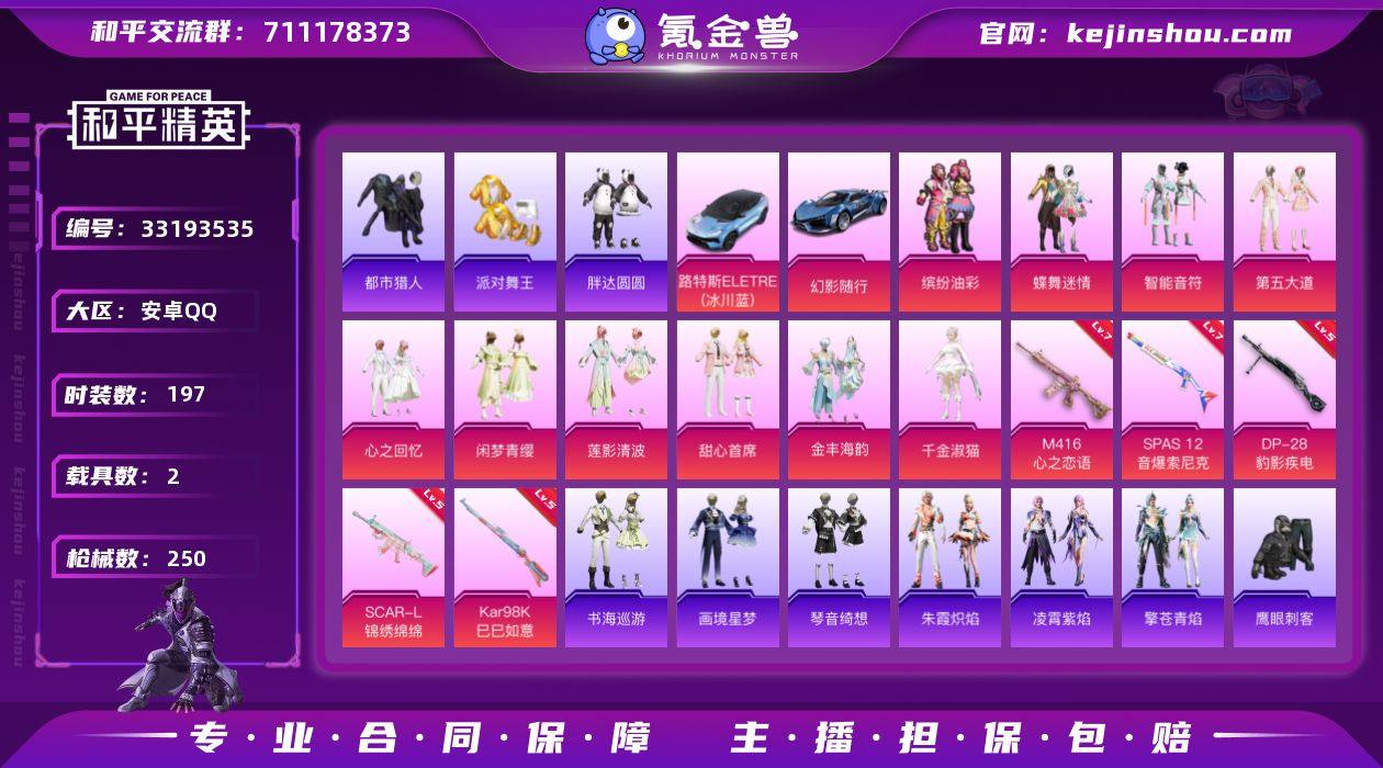 11119精品号11粉9特2载具1僚机 派对舞王 都市猎人猪妹 满级心之恋语 满级引爆索尼克 安卓 手Q-11粉装-9特效枪-2载具-4粉色飞行器-80344热力值-12王牌印记-197套装-250枪皮 【热门品类】:粉装-缤纷油彩,套装-浪漫天命,套装-都市猎人,套装-派对舞王,套装-胖达圆圆,套装-龟仙人,套装-糯粉咩咩,角色-8号机,角色-Mark.06,撬棍-龙胆亮银枪 【粉色套装】:粉装-蝶舞迷情,粉装-智能音符,粉装-缤纷油彩,粉装-第五大道,粉装-心之回忆,粉装-闲梦青缨,粉装-莲影清波,粉装-甜心首席,粉装-金丰海韵,角色-千金淑猫,角色-花中眠 【粉色枪皮等级】:SCAR-L-锦绣绵绵(五级),M416-心之恋语(七级),ACE32-萌骑漫游(二级),Kar98K-巳巳如意(五级),Mk14-福马献瑞(五级),SPAS-12-音爆索尼克(七级),M249-霁蓝缠春(六级),DP-28-豹影疾电(五级),MG-36-虹云熊熊(四级) 【粉色载具】:路特斯ELETRE(冰川蓝),幻影随行,僚机-萌兔起飞 【粉色枪皮】:SCAR-L-锦绣绵绵,M416-心之恋语,ACE32-萌骑漫游,Kar98K-巳巳如意,Mk14-福马献瑞,SPAS-12-音爆索尼克,M249-霁蓝缠春,DP-28-豹影疾电,MG-36-虹云熊熊 【粉色飞行器】:炫彩糖果飞行器,春暖花开飞行器,镜光幻境飞行翼...