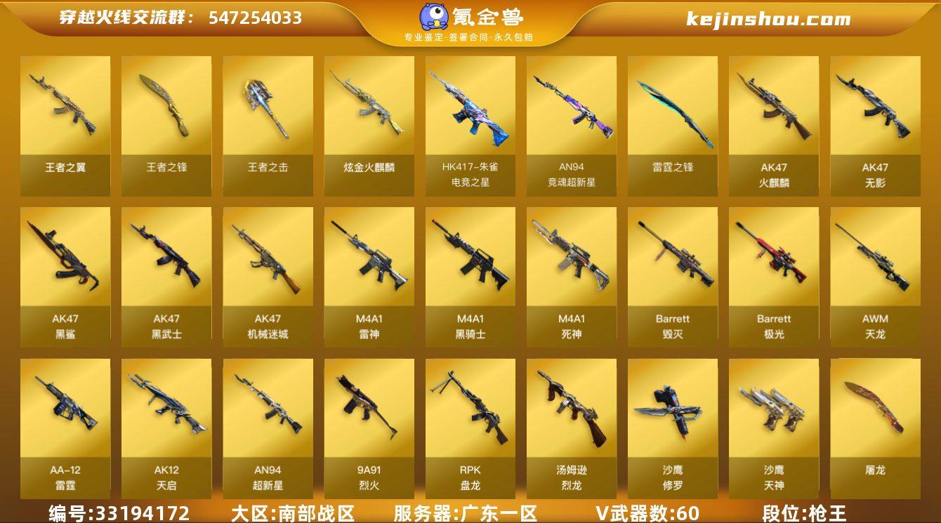DYCF135【60V 王者之翼/击/锋 炫金火麒麟 6烈龙】【等级】100【区服】广东一区【英雄角色】1【英雄武器】60【王者级武器】王者之魄高爆手雷 王者之翼 王者之锋 王者之锋 王者之击【炫金级武器】炫金火麒麟【英雄级角色】幻面灵狐 团团【英雄级武器】Barrett-毁灭 闪光弹-神工天巧 高爆手雷-神工天巧 闪光弹-神工天巧 烟雾弹-神工天巧 HK417-朱雀-电竞之星 屠龙-电竞之星 AA-12-雷霆 AK47-无影 M4A1-黑骑士 斩神刀-雷暴 高爆手雷-雷暴 烟雾弹-雷暴 闪光弹-雷暴 雷霆之锋 高爆手雷-雷霆 烟雾弹-雷霆 闪光弹-雷霆 AK47-火麒麟 AK47-无影 9A91-烈火 9A91-烈火 M4A1-雷神 Barrett-毁灭 麒麟刺 麒麟刺 屠龙 M4A1-死神 麒麟刺 沙鹰-天神 AK47-黑鲨 龙啸 AK47-黑鲨 沙鹰-天神 barrett-金色蔷薇 AK47-黑鲨 沙鹰-天神 AK47-机械迷城 barrett-金色蔷薇 麒麟刺 RPK-盘龙 AK47-黑武士 沙鹰-天神 M4A1-黑骑士 沙鹰-天神 AK12-天启 汤姆逊-烈龙 屠龙 沙鹰-修罗 AWM-天龙 汤姆逊-烈龙 沙鹰-天神 沙鹰-天神 沙鹰-天神 Barrett-极光 汤姆逊-烈龙 汤姆逊-烈龙 汤姆逊-烈龙 AN94-超新星 汤姆逊-烈龙 M200-玄龙 【源级武器】源·毁灭 魂·裁决-神秘按键 源-裁决 灵·Barrett-金色蔷薇-甜蜜火力 源·龙啸...