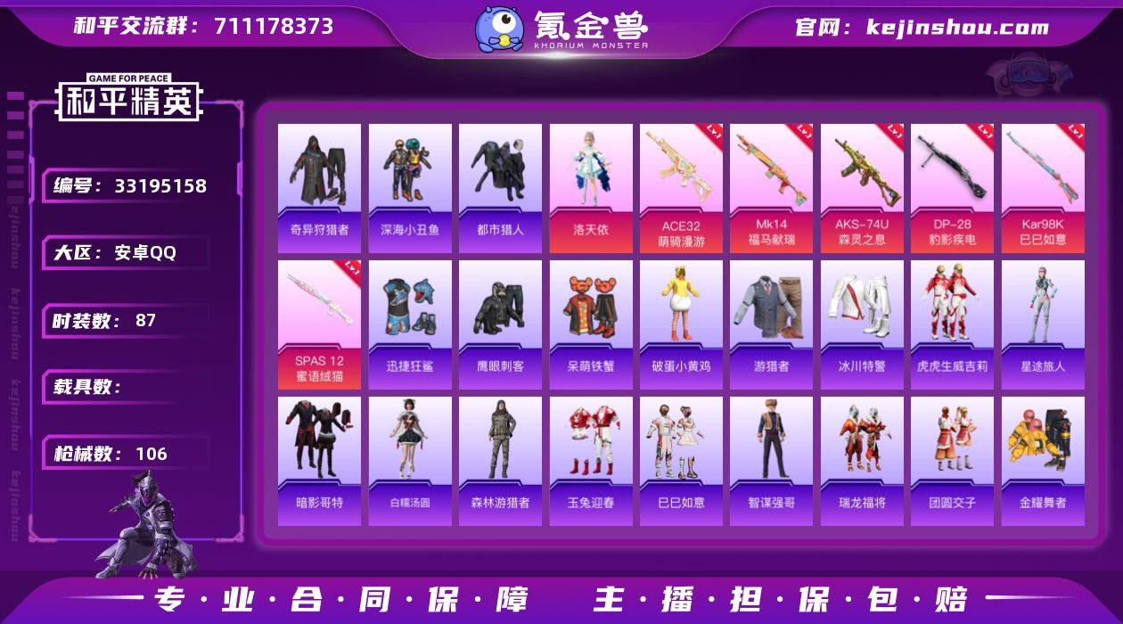 M1047523【身法号1粉装-6特效枪小雾神 洛天依 市猎人,深海小丑鱼,忍者信条,奇异狩猎者,暗影哥特】无二次包安卓手Q-1粉装-6特效枪-87套装-106枪皮-3王牌印记-荣耀皇冠Ⅴ-30205热力值【1粉装】角色-洛天依【6特效枪】AKS-74U-森灵之息[3级],Mk14-福马献瑞[5级],ACE32-萌骑漫游[2级],DP-28-豹影疾电[3级],SPAS-12-蜜语绒猫[4级],Kar98K-巳巳如意[3级]【8稀有】都市猎人,深海小丑鱼,忍者信条,奇异狩猎者,暗影哥特,M24-奇异狩猎者,M762-奇异狩猎者,汤姆逊-奇异狩猎者【4飞行器】闪光银龙飞行器,粉色滑翔尾迹,空岛之星尾迹,马上有福飞行器【2头盔】幻影战神头盔,深海小丑鱼头盔【2背包】幻影战神背包,百万伏特背包【178其它衣服和枪皮】破蛋小黄鸡,特种颜团子,魅力单车,蓝调潮人,萌趣颜团子,瑞龙福将,疯狂小兔子,战术大师,金耀舞者,巳巳如意,呆萌铁蟹,虚音幻奏,竞技名士,团圆交子,幻世战舞者,田园牧歌,怒火燎原,SS38特训,耀眼新星,SS14特训,SS32特训,SS15特训,深蓝色名流,红色运动,覆海蛟龙,马上有钱,萌黄之夏,冰原奔狼,黄色名流,竞技达人朋克,红釉青花,完美偶像,鹰眼刺客,冰冻风暴,迅捷狂鲨,六六大吉,白色伏地魔,SS20特训,长空猛禽,玉兔迎春,星途旅人,湖蓝色名流,光之冒险,雨过天青,...