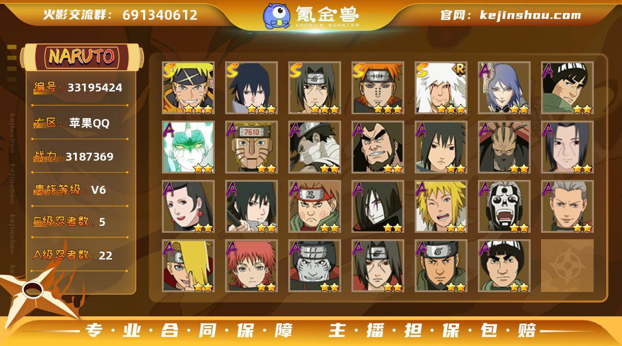 IOS/5S忍/22A忍/战力318W/V6/区服860 【S忍者】 宇智波佐助「漩涡鸣人」,宇智波佐助「永恒万花筒」,自来也「舞之豪杰」,宇智波鼬「须佐能乎」,佩恩「天道」, 【A忍者】 小南「神驹佑将」,机械鸣人「初始形态」,巳月「仙人模式」,迈特凯「青春爆炸」,不缘,宇智波鼬「夏日限定」,蝎「绯流琥」,宇智波泉奈,神农「羁绊」,桃地再不斩「秽土转生」,宇智波佐助「须佐能乎」,秋道丁次「忍界大战」,大蛇丸「晓」,波风水门「新春限定」,飞段「死司凭血」,飞段,迪达拉,蝎,干柿鬼鲛,宇智波鼬,猿飞阿斯玛,迈特凯, PX_2484953