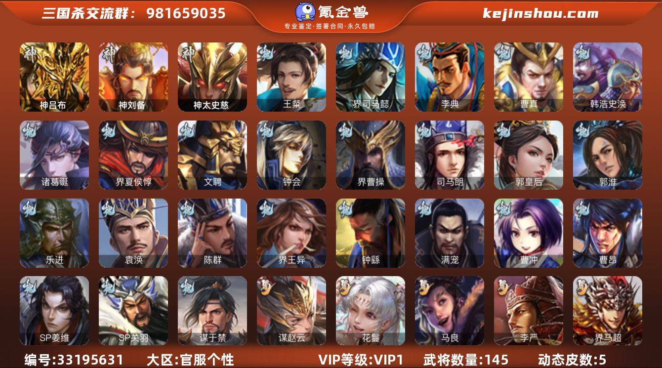 【4737】官阶:先锋将军;VIP等级:VIP1;史诗武将数量:9;动态皮肤数量:5;武将总数:145;史诗宝珠数量:0;将魂数量:224;神将:3;魏国史诗武将:4;蜀国史诗武将:2;吴国史诗武将:1;群史诗武将:2/神吕布/神刘备/神太史慈/王粲/谋赵云/花鬘/界徐盛/麹义/星甘宁/谋于禁/袁涣/界曹操/界司马懿/界夏侯惇/钟会/曹冲/郭淮/满宠/曹真/韩浩史涣/陈群/钟繇/界王异/郭皇后/诸葛诞/曹昂/SP关羽/SP姜维/文聘/乐进/司马朗/李典/唐咨/华雄/袁术/羊祜/界华佗/界袁术/公孙瓒/伏皇后/李儒/公孙渊/界公孙瓒/曹节/伏完/张宝/刘琦/王濬/费祎/界刘备/界马超/关兴张苞/廖化/关平/简雍/刘封/吴懿/周仓/张松/李严/马良/SP徐庶/杨仪/彭羕/吴班/甘夫人/谋小乔/桥公/界甘宁/界黄盖/界周瑜/界大乔/界陆逊/程普/韩当/潘璋马忠/虞翻/孙鲁班/朱桓/顾雍/全琮/界孙鲁班/界朱治/孙登/诸葛瑾/孙鲁育/诸葛恪/张布/钟会-谋谟之勋(动态)/曹植-龙年中秋(动态)/星甘宁-锦帆游侠(动态)/麹义-扬刀立威(动态)