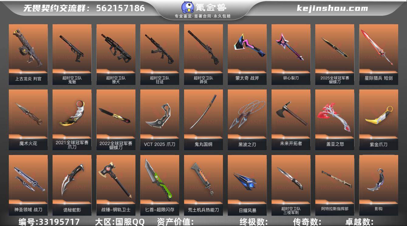 【特价走量】精品手慢无系列!【可秒换绑 自带包赔】 【套装】:2025全球冠军赛套装,2022全球冠军赛套装,2021全球冠军赛套装,超时空卫队套装,无畏契约季前邀请赛套装,VCT 2025 赛季套装,西部未来套装,掠影//2.0套装,般若假面//2.0套装 【近战武器】:近战武器-2025全球冠军赛 蝴蝶刀,近战武器-2022全球冠军赛 蝴蝶刀,近战武器-2021全球冠军赛 爪刀,近战武器-碎心裂刃,近战武器-无畏契约季前邀请赛 悲悯之刃,近战武器-魔术火花,近战武器-影钩,近战武器-超时空卫队 三棱军刺,近战武器-VCT 2025 爪刀,近战武器-紫金爪刀,近战武器-黑波之刃,近战武器-鬼丸国纲,近战武器-未来开拓者,近战武器-珍珠棘贝 短剑,近战武器-超能偶像 应援棒,近战武器-超限闪存 匕首,近战武器-盖亚之怒,近战武器-钢轨卫士 战锤,近战武器-荒土机兵 热能刀,近战武器-魄月玄刃,近战武器-诡秘蛇影 军刀,近战武器-神圣领域 战刀,近战武器-日耀风暴 遗器,近战武器-阿特拉斯指挥部 甩棍,近战武器-星际猎兵 短剑,近战武器-魔术火花 【狂徒】:狂徒-2025全球冠军赛,狂徒-2021全球冠军赛,狂徒-归零者,狂徒-洪荒怒焰,狂徒-混沌序曲,狂徒-双城之战,狂徒-偃月苍龙,狂徒-创·...