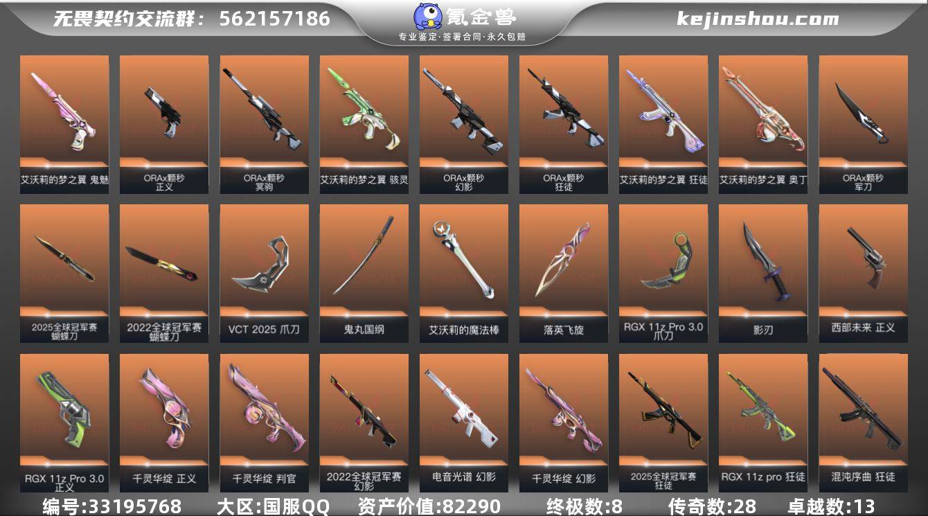 段位: 未定级 亮点皮肤: 幻影-2022全球冠军赛,蝴蝶刀-2022全球冠军赛 近战武器皮肤: 落英飞旋-千灵华绽,艾沃莉的魔法棒,爪刀-RGX 11z Pro 3.0,影刃-掠影,鬼丸国纲-般若假面//2.0,VCT 2025 爪刀,2025全球冠军赛 蝴蝶刀,ORAx颗秒 军刀 步枪皮肤: 狂徒-紫阙金琅,狂徒-盖亚的复仇,幻影-侦察力量,狂徒-堕天遗武,幻影-千灵华绽,狂徒-海洋之星,狂徒-艾沃莉的梦之翼,狂徒-混沌序曲,狂徒-掠影,戍卫-掠影,狂徒-般若假面//2.0,獠犬-般若假面//2.0,幻影-电音光谱,狂徒-RGX 11z pro,2025全球冠军赛 狂徒,幻影-ORAx颗秒,狂徒-ORAx颗秒 佩枪皮肤: 正义-千灵华绽,鬼魅-艾沃莉的梦之翼,正义-RGX 11z Pro 3.0,正义-掠影,狂怒-般若假面//2.0,正义-西部未来,正义-ORAx颗秒 狙击枪皮肤: 冥驹-千灵华绽,莽侠-RGX 11z Pro 3.0,冥驹-掠影,冥驹-ORAx颗秒 冲锋枪皮肤: 骇灵-艾沃莉的梦之翼 霰弹枪皮肤: 判官-千灵华绽 机枪皮肤: 奥丁-艾沃莉的梦之翼,战神-般若假面//2.0 亮点: 【充值总皮肤】: ORA x 颗秒 军刀, ORA x 颗秒 幻影, ORA x 颗秒 狂徒, ORA x 颗秒 冥驹, ORA x 颗秒 正义, 2025全球冠军赛 狂徒, 2025全球冠军赛 蝴蝶刀, 2022全球冠军赛 幻影, 2022全球冠军赛 蝴蝶刀, RGX 11z Pro 狂徒, 电音...