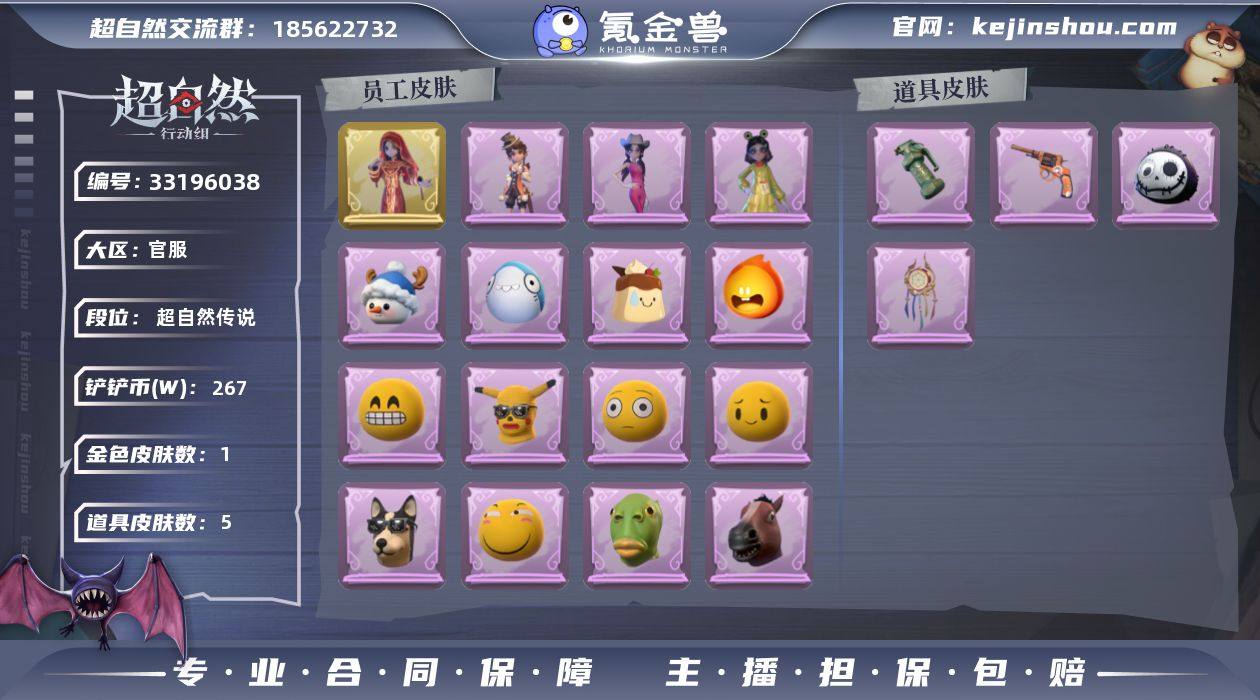 ZR605,金皮:1,紫皮:3,道具皮:5,外观:巫铃儿-镜花辞,阿念-庆宴绮愿,爱丽丝-耀眼的你,小黄-呱呱雨衣,道具:急救包-蔷薇物语,闪光弹-金戈玄铜,腰包-惊魂娃娃,转轮手枪-新星时代,音响-鸣沙鼓,员工:小黄,爱丽丝,零,阿念,逍遥,薇薇安,巫铃儿,莉莉,艾伦,爱德华,兰,小满,临云,头饰:烛光纪念,太空鲨头套,雪墩墩头套,蒜了八,樱桃奶油布丁,惊魂南瓜头套,鱼头怪头套,烈焰红唇头套,大葱明头套,火爆了头套,面具马头套,哈士奇头套,萨卡班甲鱼头套,嘻嘻头套,滑稽头套,呆滞头套,卑微头套,像素朋克墨镜,后室幸存者头套,挂饰:桂冠聆诗,未竟乐园,孤独对望,糖果守卫,动作:新年摇,luvaboy,拜年,胜利之舞,举牌,抬手,小鸡舞,赛季魔盒:普通魔盒,累充:590金砖,段位:超自然传说,铲铲币:267w
