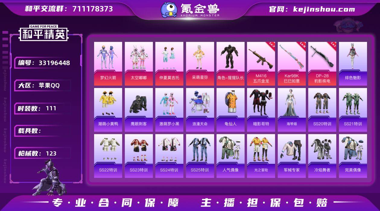苹果【小号 粉装-梦幻火箭,套装-浪漫天命,套装-暗影哥特,416-五爪金龙(七级),Kar98K-巳巳如意(四级】 手Q-6粉装-4特效枪-0载具-4粉色飞行器-39514热力值-4王牌印记-111套装-123枪皮 【热门品类】:粉装-梦幻火箭,套装-浪漫天命,套装-龟仙人,套装-潮萌小黄鸭,套装-暗影哥特 【粉色套装】:角色-六号石头人,粉装-梦幻火箭,粉装-太空嘟嘟,粉装-仲夏莫吉托,角色-呆萌星弥,角色-猩猩队长 【粉色枪皮等级】:M416-五爪金龙(七级),Kar98K-巳巳如意(四级),Mk14-福马献瑞(五级),DP-28-豹影疾电(一级) 【粉色枪皮】:M416-五爪金龙,Kar98K-巳巳如意,Mk14-福马献瑞,DP-28-豹影疾电 【粉色飞行器】:梦幻火箭飞行器,甜蜜誓约飞行器,千面幻镜飞行器,全功率超战飞行器 【粉色降落伞】:梦幻火箭降落伞,环太平洋降落伞,垂柳戏鸭降落伞,暗夜鎏金降落伞,未来歌姬降落伞,荧海星豚降落伞,炫彩糖果降落伞 【稀有套装】:套装-龟仙人,套装-马上有钱,套装-迅捷龙虾,角色-海琴烟,角色-绯色魅影 【稀有枪皮】:AKM-环太平洋,AKM-生命誓言,AKM-龙的传人,M16A4-幻世战舞者,M16A4-甜心亚梦,M16A4-蓝色火焰,SCAR-L-夜灯,SCAR-L-炫彩节奏,SCAR-L-玉兔迎春,M416-暗...