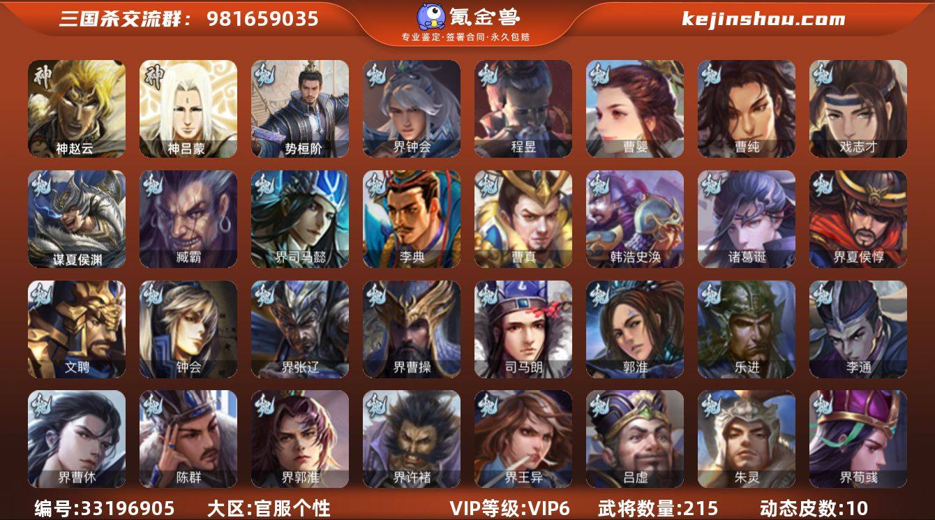 神赵云,界钟会,曹婴,曹纯,戏志才,程昱,势桓阶,谋诸葛亮,谋马超,谯周,势魏延,势太史慈,星黄忠,界李儒,神吕蒙,SP关羽,SP曹仁,SP蔡文姬,乐进,曹昂,诸葛诞,朱灵,文聘,SP姜维,钟会,曹冲,郭淮,满宠,界王异,界曹操,界司马懿,界夏侯惇,界张辽,界许褚,界郭嘉,李典,曹真,韩浩史涣,陈群,曹叡,曹休,钟繇,司马朗,李通,吕虔,鲁芝,界荀彧,界满宠,界郭淮,蔡贞姬,界曹休,谋夏侯渊,臧霸,势陈到,SP孙尚香,关银屏,夏侯霸,马良,关兴张苞,廖化,界马岱,关平,简雍,刘封,界法正,界关兴张苞,界刘备,界关羽,界马超,SP徐庶,吴懿,周仓,张松,刘谌,夏侯氏,马忠,李严,黄皓,界庞统,吕凯,张翼,杨仪,傅肜,界简雍,糜夫人,界周仓,谋庞统,谋张飞,吴班,诸葛果,甘夫人,凌操,诸葛瑾,孙鲁育,程普,韩当,潘璋马忠,虞翻,界甘宁,界黄盖,界周瑜,界大乔,界陆逊,孙鲁班,朱桓,顾雍,界孙权,界孙尚香,潘濬,许贡,孙邵,孙翊,吕范,界顾雍,谋周瑜,界全琮,势鲁肃,友庞统,伏完,刘协,界袁术,SP赵云,张宝,伏皇后,李儒,华雄,袁术,界华佗,...