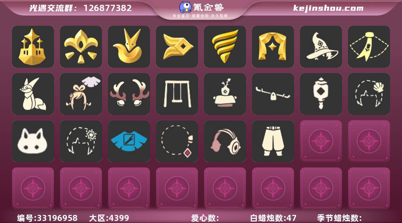 【sh407】 ✅7季羽毛白枭玫瑰小号巫师武士裤tgc蝙蝠围巾创始人蛛丝水晶球茶桌超多礼包✅渠道 :vivo ✅资源:蜡烛:47爱心:69翼数量:181 ✅毕业地图:全图毕业 ✅毕业季节:欧若拉半,梦想季,集结季,王子季,风行季,潜海季,表演季 ✅稀有礼包:音韵吉他,星月头冠,彩虹耳坠,彩虹耳机,冥龙角,鹿角,姆明饰,温暖绒帽,鲤跃头,南瓜头,巫师帽,猫耳,绊爱,贝壳发饰,蓝色音乐符,雪花发夹,兔子发饰,大橘大利,鲤鱼头,四叶草,TGC斗,创始人斗,小王子斗,蝙蝠斗,蛛丝斗篷,瑞雪斗篷,白雪斗篷,绊爱斗篷,中秋灯笼,夏日阳伞,情人秋千,情人跷跷板,花憩茶桌,狐狸背包,情人小船,雪花水晶球 ✅热门物品:蝴蝶结,公主头,正太,樱花,猫猫头,搓澡巾,武士裤,白棉裤,花环,宴会围巾,虚荣,红耳机,黄鼠狼面具,红狐狸面具,花瓣斗篷,红金斗篷,白金斗篷,白鸟斗篷,吉他,高音钢琴,笛子,排箫,铃铛,雨伞