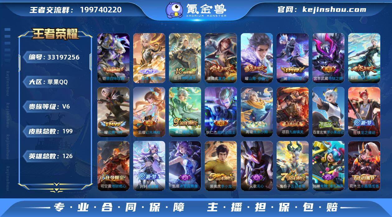 MCK631486 【曜无双!凯典藏!】 皮肤数量199 印记总数14 【V6】 【至尊星耀】 【暂时不可修改】 账号类型3 无双1 荣耀典藏1 传说10 史诗44 账号类型:上单号,打野号,中单号; 无双:曜_器灵螭龙剑; 荣耀典藏:铠_银白咏叹调; 传说:宫本武藏_地狱之眼,后羿_神树通天,狄仁杰_超时空战士,云缨_幻光神枪,桑启_鸣野蒿,曜_云鹰飞将,裴擒虎_寅虎赤拳,赵云_乘龙铭钟鼎,澜_逐花归海,曜_山海苍雷引; 史诗:嬴政_摇滚巨星,百里玄策_罗小黑战记,墨子_龙骑士,曹操_幽灵船长,嬴政_暗夜贵公子,周瑜_线条小狗,项羽_九幽镇关,狂铁_龙之律动,阿珂_化蝶舞,梦奇_顽趣,小乔_缤纷独角兽,牛魔_星界战将,蔡文姬_舞动绿茵,裴擒虎_李小龙,吕布_圣诞狂欢,妲己_女仆咖啡,李元芳_逐浪之夏,貂蝉_圣诞恋歌,百里玄策_原初追逐者,狄仁杰_魔术师,程咬金_功夫厨神,狄仁杰_鹰眼统帅,刘禅_天才门将,云中君_纤云弄巧,赵云_皇家上将,蒙恬_荣光圣徽,百里守约_特工魅影,司空震_地狱燃心,蒙犽_百解令,甄姬_冰雪圆舞曲,兰陵王_暗隐猎兽者,阿古朵_江河有灵,刘禅_电玩爆裂旋风,孙尚香_蔷薇恋人,花木兰_水晶猎龙者,孙策_猫狗日记,元歌_无心,孙尚香_水果甜心,白起_星夜...