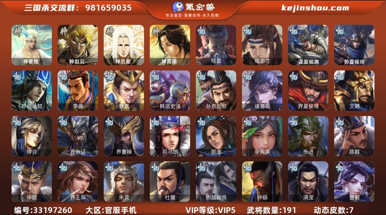 神赵云,神姜维,戏志才,程昱,界黄忠,神吕蒙,神周瑜,势夏侯尚,SP关羽,SP蔡文姬,乐进,曹昂,诸葛诞,朱灵,文聘,SP姜维,钟会,曹冲,郭淮,满宠,界王异,界曹操,界司马懿,界夏侯惇,界张辽,李典,曹真,韩浩史涣,陈群,曹叡,钟繇,司马朗,孙资刘放,辛宪英,蒯越蒯良,杜畿,华歆,谋夏侯渊,SP孙尚香,关银屏,夏侯霸,马良,关兴张苞,廖化,界马岱,关平,刘封,界法正,界关兴张苞,界刘备,界赵云,界马超,SP徐庶,吴懿,周仓,张松,夏侯氏,糜竺,赵统赵广,严颜,界伊籍,张翼,傅肜,界简雍,界张嶷,吴班,诸葛果,甘夫人,凌操,诸葛恪,诸葛瑾,孙鲁育,程普,韩当,潘璋马忠,虞翻,界甘宁,界黄盖,界周瑜,界大乔,界陆逊,孙鲁班,朱桓,阚泽,孙登,潘濬,孙亮,吕岱,许贡,界韩当,孙邵,蒋钦,谋韩当,伏完,界袁术,SP赵云,张宝,伏皇后,李儒,界张角,华雄,袁术,界华佗,公孙瓒,蔡夫人,公孙渊,SP黄月英,董白,曹节,SP太史慈,界庞德,界公孙瓒,胡车儿,荀谌,王濬,陈珪,乐就,骥李典,势陆郁生-素心傲雪(动态),孙寒华-蛇年限定(动态),李儒-业火毒...