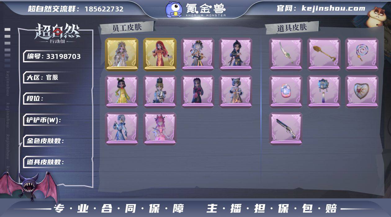 金皮2;紫皮8;道具皮18;皮肤:巫铃儿-镜花辞,薇薇安-圣光之谕,零-青云逸歌,爱丽丝-丝缕哀歌,逍遥-绣春逍影,莉莉-除妖小师妹,阿念-王子与骑士,小黄-呱呱雨衣,莉莉-情公主,小黄-霓裳踏雪;道具:刺刀-碧络琅环,铲子-龙鳞,腰包-月下莲台,长鞭-飞天绫,传送按钮-幻宠之门,急救包-蔷薇物语,短管猎枪-星光的裁决,腰包-宝剑八,转轮手枪-新星时代,摸金符-紫霄,传送按钮-昆仑镜,额外的背包-飞花令,音响-鸣沙鼓,夜视仪-金丝眼镜,黄牛能量饮料-青玉抱丹,喷气背包-乘风溯雪,音响-happy猫,摸金符-花落精绝;饰品:头饰-惊魂南瓜头套,头饰-嘻嘻头套,头饰-哈士奇头套,头饰-卑微头套,头饰-樱桃奶油布丁,头饰-火爆了头套,头饰-烈焰红唇头套,头饰-萨卡班甲鱼头套,头饰-滑稽头套,头饰-面具马头套,头饰-鱼头怪头套,头饰-炙热烧烤,头饰-雪墩墩头套,头饰-呆滞头套,头饰-大葱明头套,头饰-太空鲨头套,头饰-像素朋克墨镜,头饰-后室幸存者头套,挂饰-尘封旧事,挂饰-九色祥鹿,挂饰-未竟乐园,挂饰-钗头凤,背饰-绒团小狐狸,背饰-蝶恋花,背饰-毛球夹子,背饰-子夜证词;动作:动作-孤身摇,动作-刀马舞,动作-小雨摇,动作-舞台中心,动作-luvaboy,动作-鸳鸯戏,动作-鹏友摇,动作-DL摇,动作-律动迪斯科,动作-KT猫摇...