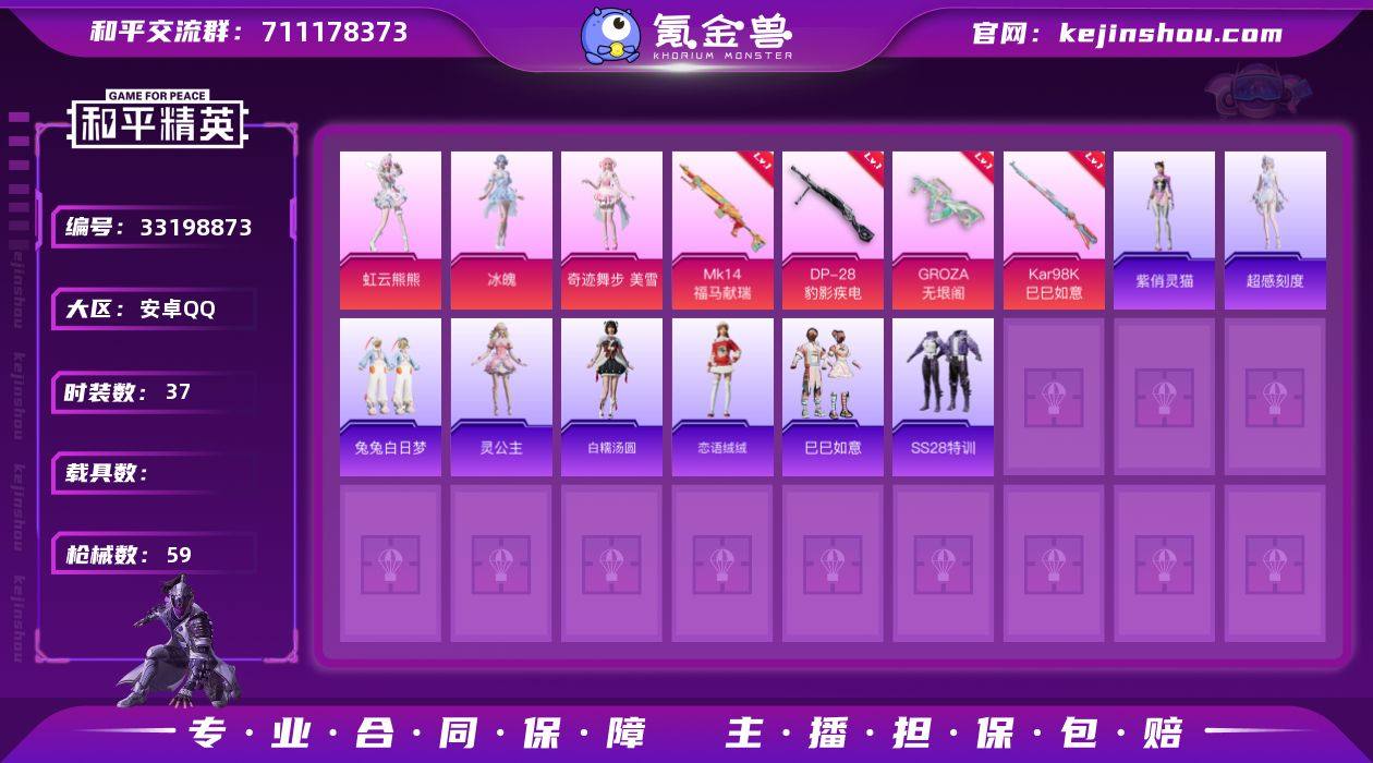 M1047533【女号3粉装-4特效枪】安卓手Q-3粉装-4特效枪-37套装-59枪皮-1王牌印记-不朽星钻Ⅱ-16355热力值【3粉装】角色-奇迹舞步 美雪,角色-虹云熊熊,角色-冰魄【4特效枪】Kar98K-巳巳如意[3级],Mk14-福马献瑞[5级],DP-28-豹影疾电[3级],GROZA-无垠阁[3级]【3飞行器】登顶巅峰飞行器,炫彩糖果飞行器,狂鲨锋刃飞行器【89其它衣服和枪皮】角色-紫俏灵猫,幻世战舞者,缤纷果语,SS28特训,完美偶像,角色-灵公主,秘语星愿,SS37特训,绮丽涂鸦,巳巳如意,超能元气,SS38特训,街头潮人,午间小调,猛禽,SS36特训,超能勇士,SS35特训,疯狂小兔子,福马献瑞,角色-霜纹水星,特训学院,兔兔白日梦,炫彩糖果,战术大师,风迹短诗,马上来财,白糯汤圆,角色-超感刻度,恋语绒绒,魅力单车,迅捷龙虾,狙击之神,蓝色运动,铝热弹-炫彩糖果,蜜獾-启元战纹,AUG-冰晶雪宝,G36C-星穹咏叹调,20-H-狂鲨锋刃,SCAR-L-红色方程式,DP-28-彩虹符号,十字弩-异瞳寒姬,M16A4-红色方程式,12-风迹短诗,平底锅-无垠阁,AWM-奇迹舞步,蝎式手枪-虹云熊熊,GROZA-福马献瑞,AWM-天降萌叽,UZI-炫彩糖果,蜜獾-天降萌叽,平底锅-属我最6,VSS-香桃花海,Mk47-风迹短诗,突击盾牌-绝对恒星,汤姆逊-天降萌叽,汤姆逊-像素花束,S1897-荧海星豚,UMP45-...
