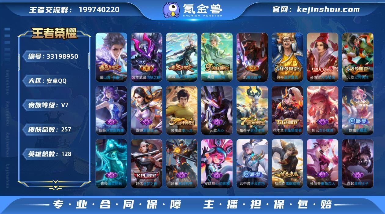 V7 1典藏 1珍品 11传说 257皮肤 128英雄 【1水晶】【1珍品传说】【11传说】曜-山海·苍雷引,宫本武藏-地狱之眼,铠-绛天战甲,赵云-乘龙·铭钟鼎,桑启-鸣野蒿【48史诗】元歌-无心,鬼谷子-五谷丰年,赵云-未来纪元,阿轲-节奏热浪,安琪拉-心灵骇客,白起-星夜王子,百里守约-特工魅影,蔡文姬-舞动绿茵,曹操-幽灵船长,嫦娥-拒霜思,程咬金-功夫厨神,妲己-女仆咖啡,妲己-魅力维加斯,大乔-猫狗日记,狄仁杰-魔术师,狄仁杰-鹰眼统帅,典韦-蓝屏警告,貂蝉-圣诞恋歌,伽罗-箭羽风息,宫本武藏-鬼剑武藏,韩信-逐梦之影,花木兰-水晶猎龙者,兰陵王-暗隐猎兽者,李元芳-逐浪之夏,廉颇-地狱岩魂,刘邦-德古拉伯爵,露娜-紫霞仙子,吕布-圣诞狂欢,吕布-末日机甲,墨子-金属风暴,上官婉儿-梁祝,裴擒虎-李小龙,孙策-猫狗日记,孙尚香-水果甜心,孙尚香-蔷薇恋人,孙悟空-大圣娶亲,王昭君-偶像歌手,项羽-苍穹之光,雅典娜-冰冠公主,嬴政-摇滚巨星,嬴政-暗夜贵公子,元歌-云间偶戏,云中君-纤云弄巧,赵云-皇家上将,甄姬-冰雪圆舞曲,庄周-高山流水,鲁班七号-蔬乡物语,蒙犽-百解令