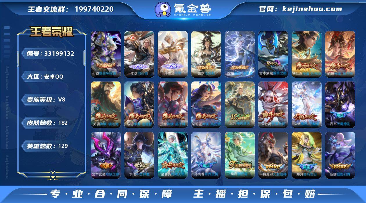 【马年限定全套】实名: 可修改 贵族等级: V8 英雄数: 129 皮肤数: 182 荣耀水晶: 银白咏叹调 无双皮: 无相,问心剑 珍品传说: 器灵·落星盏,沧流箭 星传说: 幽冥之眼 传说皮: 猫影幻舞,久胜战神,一念神魔,云霓雀翎,地狱之眼,金乌负日,神树通天,神骥·赴朔漠,神骥·鸣幻洲,神骥·越千峰,神骥·逐星野,神骥·镇沧海,神骥·聚万邦 限定皮: 李小龙,祈雪灵祝,游园惊梦,时雨天司,异界灵契-孙尚香,天魔缭乱,时之彼端,如梦令-后羿,默契交锋-花木兰,冰霜神祇,鸣野蒿,愿照·千秋盛