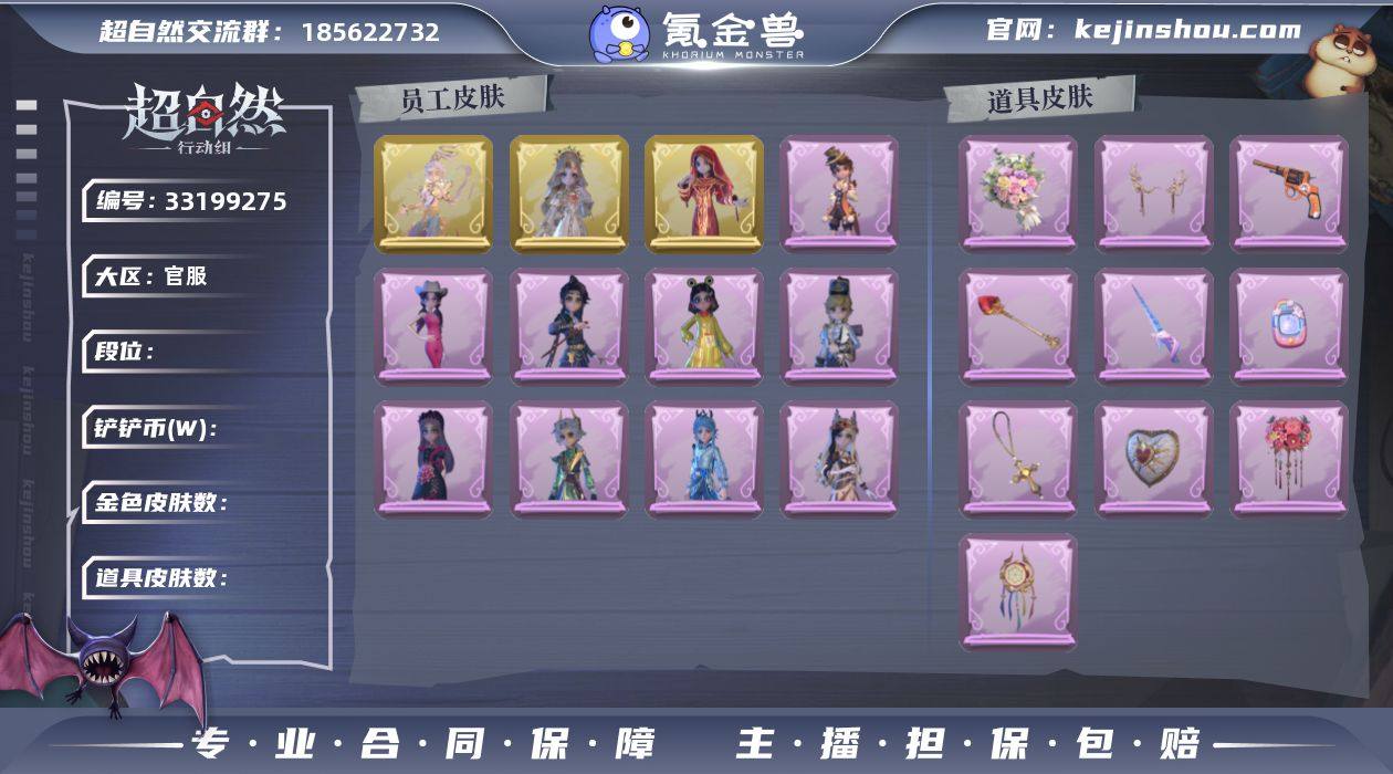 金皮3;紫皮9;道具皮27;皮肤:巫铃儿-镜花辞,薇薇安-圣光之谕,逍遥-莲华渡,爱丽丝-丝缕哀歌,逍遥-泽引山海,逍遥-绣春逍影,阿念-王子与骑士,小黄-呱呱雨衣,薇薇安-白光莹,阿念-庆宴绮愿,爱丽丝-耀眼的你,艾伦-水王子;道具:腰包-宝剑八,夜视仪-敛花容,桃木剑-最后的独角兽,铲子-圣心之泪,额外的背包-灵感泉之花,转轮手枪-新星时代,音响-鸣沙鼓,额外的背包-飞花令,摸金符-祝祷词,传送按钮-幻宠之门,葫芦-伏妖塔,黄牛能量饮料-青玉抱丹,喷气背包-乘风溯雪,传送按钮-昆仑镜,摸金符-海洋之心,专业手电-云端梦想计划,刺刀-碧络琅环,急救包-末章心跳,音响-happy猫,急救包-蔷薇物语,桃木剑-凤鸣九天,夜视仪-金丝眼镜,短管猎枪-星光的裁决,闪光弹-金戈玄铜,长鞭-小狗蛇点点鞭,铲子-龙鳞,伞-伞;饰品:头饰-大葱明头套,头饰-小狗蛇点点头套,头饰-哈士奇头套,头饰-呆滞头套,头饰-火爆了头套,头饰-烈焰红唇头套,头饰-咬咬鲨头套,头饰-鱼头怪头套,头饰-萨卡班甲鱼头套,头饰-精致露比头套,头饰-卑微头套,头饰-滑稽头套,头饰-炙热烧烤,头饰-嘻嘻头套,头饰-烛光纪念,头饰-雪墩墩头套,头饰-蒜了八,头饰-面具马头套,头饰-像素朋克墨镜,头饰-后室幸存者头套,挂饰-未竟乐园,挂饰-糖果守卫,挂饰-...