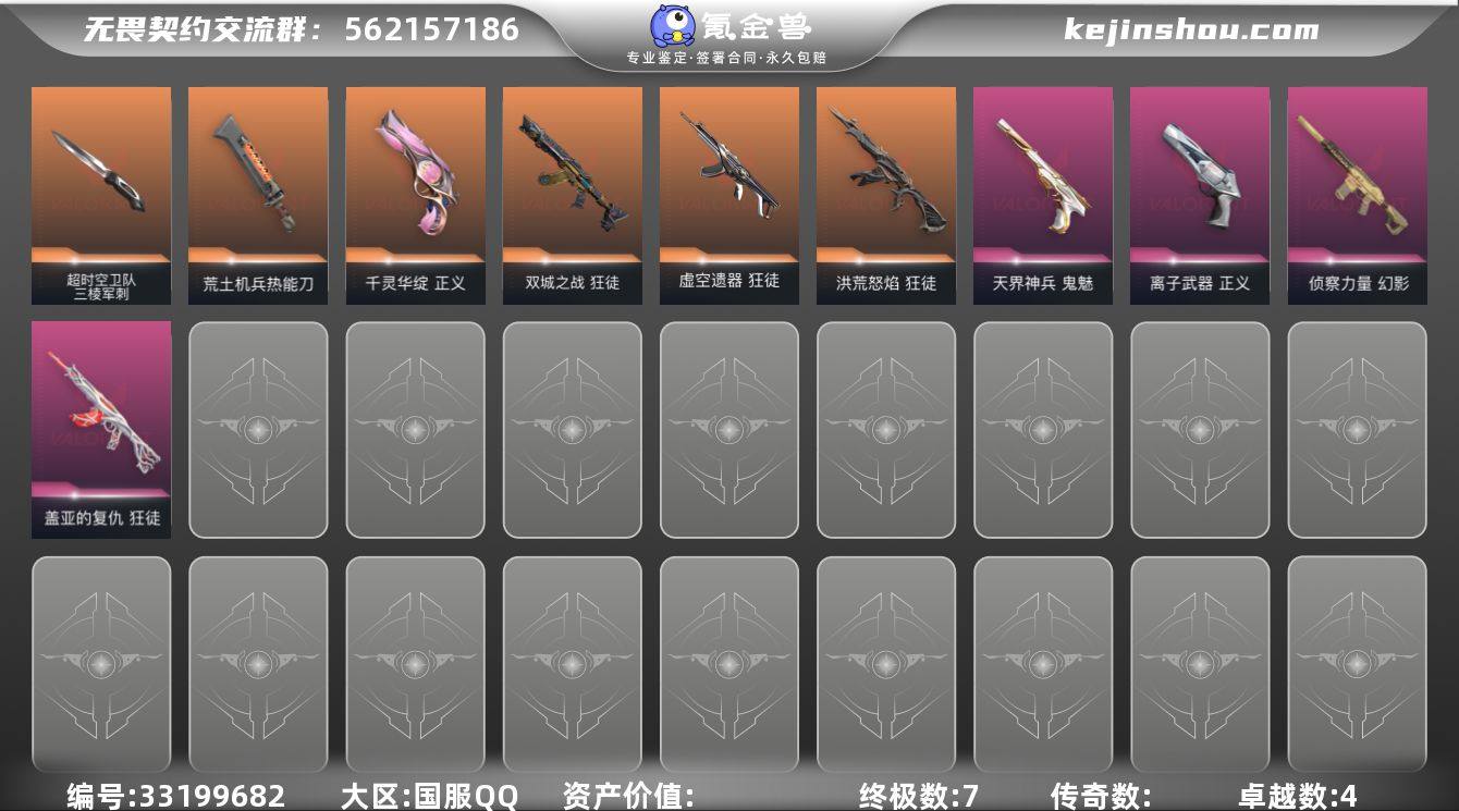【1.9W库存 神话挂饰.太刀.三棱军刺.流脓.弃王.盖亚.侦查】【英雄】:幻棱,炼狱,维斯,暮蝶,钛狐,壹决,铁臂,捷风,雷兹,幽影,不死鸟,贤者,猎枭,蝰蛇,零,芮娜,奇乐,尚勃勒,霓虹,夜露,黑梦,钢锁 【近战武器】:近战武器-超时空卫队 三棱军刺,近战武器-鬼丸国纲,近战武器-荒土机兵 热能刀 【狂徒】:狂徒-洪荒怒焰,狂徒-双城之战,狂徒-虚空遗器,狂徒-盖亚的复仇,狂徒-荒土机兵 【幻影】:幻影-侦察力量,幻影-纳米打击 【戍卫】:戍卫-逆冲蛮牛 【獠犬】:獠犬-逆冲蛮牛 【冥驹】:冥驹-荒土机兵 【奥丁】:奥丁-纳米打击 【判官】:判官-纳米打击x 【雄鹿】:雄鹿-逆冲蛮牛 【骇灵】:骇灵-荒土机兵 【标配】:标配-荒土机兵 【正义】:正义-千灵华绽,正义-离子武器,正义-纳米打击 【鬼魅】:鬼魅-天界神兵,鬼魅-诡秘蛇影 【狂怒】:狂怒-逆冲蛮牛 【卡面】:终章:激斗汉堡 卡面,进入射程 卡面,分崩离析 卡面,纳米打击 卡面,抑制技术 卡面,激斗汉堡 卡面,瓦娃脸雪糕 P2 卡面,从黄昏到黎明 卡面,荒土机兵 卡面,银弹猎手 卡面,逆冲蛮牛 卡面,《双城之战》拥抱 卡面,精灵大战 卡面,欢迎来到底城 卡面,南瓜盛典 卡面,VCT CN首冠 卡面,...