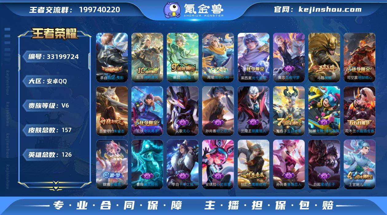 WZ22987|精品典藏传说小帅入坑号低价出 安卓QQ 157皮 贵族6级 1典藏 2传说 47史诗【荣耀典藏】鸣剑·曳影【传说皮肤】神树通天,鸣野蒿【史诗皮肤】光弋星穹,锁墨魂,百相守梦,梁祝,心灵战警,无心,驯魔猎人,暗隐猎兽者,电玩·爆裂旋安卓QQ 157皮 贵族6级 1典藏 2传说 47史诗【荣耀典藏】鸣剑·曳影【传说皮肤】神树通天,鸣野蒿【史诗皮肤】光弋星穹,锁墨魂,百相守梦,梁祝,心灵战警,无心,驯魔猎人,暗隐猎兽者,电玩·爆裂旋风,德古拉伯爵,地狱燃心,圣诞狂欢,金属风暴,拒霜思,暗夜贵公子,水果甜心,蔷薇恋人,时之恋人,心灵骇客,鬼剑武藏,真爱魔法,高山流水,乱世虎臣,吟游魔法,幽灵船长,逐浪之夏,千年之狐,顽趣,电玩高手,魔术师,鹰眼统帅,星夜王子,朱雀志,特工魅影,功夫厨神,水晶猎龙者,荣光圣徽,圣诞恋歌,皇家上将,未来纪元,节奏热浪,冰冠公主,黎明之约,白龙吟,星界特工,神威,五谷丰年【勇者皮肤】荣光之誓,线条小狗,往忆晖光,逆浪荇歌,鹤鸣心笺,踏浪烽翎,噬灭天穹,死亡骑士,金庭之子,龙腾万里,纽约教父,秘密基地,剑破天穹,阿尔法小队,圣弓游侠,野性能量,次元突破,朔风刀,守护之力,少女阿狸,时尚教父,天穹之誓,沉稳之力,归虚梦演,功夫炙烤,混沌棋,古海寻踪,缤纷绘卷,危途狂花,化身博士,...