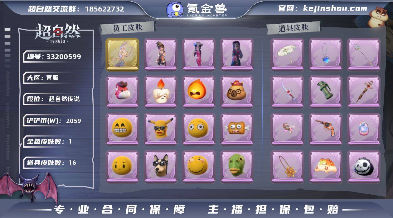 ZR683金皮:1,紫皮:3,道具皮:16,外观:逍遥-莲华渡,阿念-庆宴绮愿,爱丽丝-耀眼的你,爱丽丝-丝缕哀歌,道具:急救包-末章心跳,腰包-惊魂娃娃,电击枪-甜蜜泡泡枪,摸金符-花落精绝,闪光弹-金戈玄铜,伞-郁金春信,音响-happy猫,传送按钮-幻宠之门,摸金符-海洋之心,转轮手枪-新星时代,腰包-红运福虎,长枪-波塞冬,刺刀-铂刺与红萼,急救包-蔷薇物语,背饰-醉花阴,员工:小黄,爱丽丝,零,阿念,逍遥,薇薇安,巫铃儿,莉莉,艾伦,爱德华,兰,小满,临云,动作:新年摇,luvaboy,鹏友摇,舞台中心,姬芽摇,拜年,举牌,抬手,头饰:饺饺者,马上有钱,烛光纪念,蒜了八,小财神豚豚头套,鱼头怪头套,烈焰红唇头套,火爆了头套,面具马头套,哈士奇头套,萨卡班甲鱼头套,嘻嘻头套,滑稽头套,呆滞头套,卑微头套,小狗蛇点点头套,咬咬鲨头套,炙热烧烤,像素朋克墨镜,后室幸存者头套,挂饰:桂冠聆诗,孤独对望,天使消失的年代,糖果守卫,拂云仙,美妆:暗夜小恶魔,累充:2580金砖,赛季魔盒:普通魔盒,段位:超自然传说,铲铲币:2059w