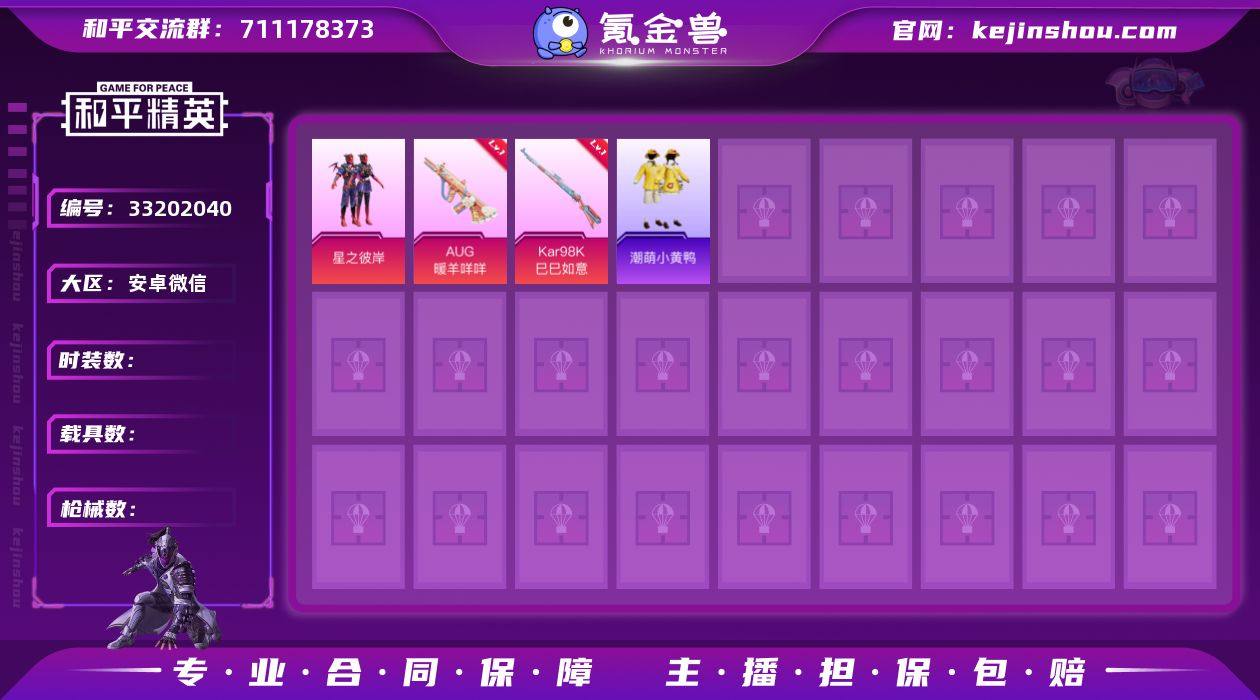 DSH2473【1粉装10特效枪特价出售 钱包空实名买到要立马实名】安卓V-1粉装10特效枪1热门54套装99枪皮 26229热力值 1印记 历史超级王牌9星 【1粉装】 星之彼岸 【10特效枪】 AKS-74U-森灵之息 (3级) Kar98K-巳巳如意 (5级) AUG-暖羊咩咩 (5级) MG3-萌骑闯关 (4级) ARX-萌骑跃动 (5级) Mk14-福马献瑞 (5级) AA12-G-萌骑幻想 (5级) PKM-萌骑夺宝 (2级) UMP45-萌骑冒险 (3级) ACE32-萌骑漫游 (2级) 【1热门】 潮萌小黄鸭 【1飞行器】 星之彼岸飞行器 【1背包】 梦幻火箭背包 营地ID:963035536