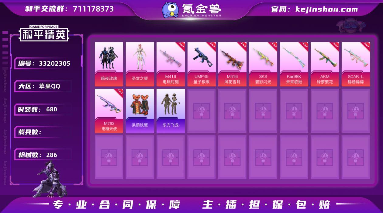 【稀有枪皮】M416电玩时刻,M416-女娲灵识,M416风花雪月,SCAR-L-锦绣绵绵,GROZA-镜光银凌,M762-电糖天使,AKM绿萝繁花,AUG-暖羊咩咩,Kar98K-巳巳如意,Kar98K未来歌姬,SKS-碧影闪光,14-福马献瑞,14-甜梦熊击,UMP45量子极限,汤姆逊-热量炸弹,DP-28-豹影疾电