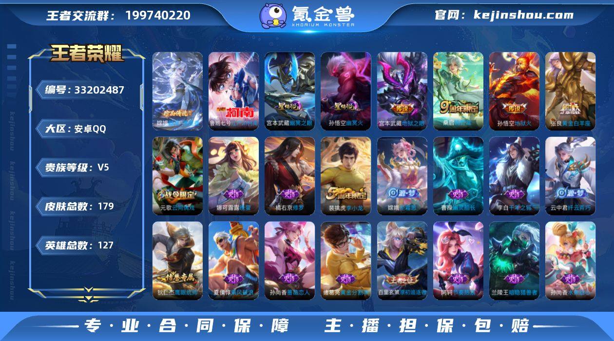 V5 2珍品 4传说 2星元 179皮肤 127英雄 【2珍品传说】鲁班七号-江户川柯南,嫦娥-器灵·落星盏【4传说】宫本武藏-地狱之眼,孙悟空-地狱火,张良-黄金白羊座,桑启-鸣野蒿【2星元】孙悟空-幽冥火,宫本武藏-幽冥之眼【26史诗】阿轲-节奏热浪,百里玄策-原初追逐者,蔡文姬-舞动绿茵,曹操-幽灵船长,嫦娥-拒霜思,狄仁杰-鹰眼统帅,宫本武藏-鬼剑武藏,橘右京-修罗,兰陵王-暗隐猎兽者,李白-千年之狐,蒙犽-狂想玩偶喵,墨子-金属风暴,娜可露露-晚萤,裴擒虎-李小龙,孙尚香-水果甜心,孙尚香-蔷薇恋人,夏侯惇-乘风破浪,小乔-缤纷独角兽,嬴政-摇滚巨星,元歌-云间偶戏,云中君-纤云弄巧,赵云-皇家上将,钟无艳-王者之锤,诸葛亮-黄金分割率,庄周-高山流水,阿古朵-顽趣