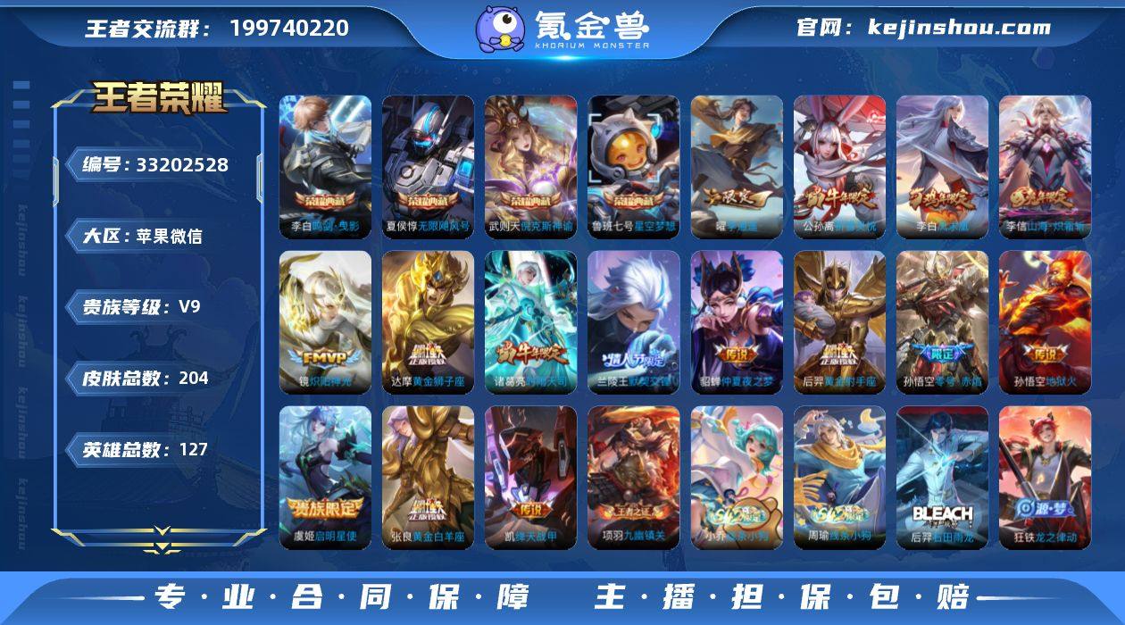 【v9 204皮 5典藏 武则天 李白 倪克斯神谕 夏侯惇 鲁班七号 15传说 2星传说】实名: 可修改 贵族等级: V9 英雄数: 127 皮肤数: 204 荣耀水晶: 武则天,星空梦想,倪克斯神谕,无限飓风号,鸣剑·曳影 传说皮: 黄金狮子座,黄金射手座,绛天战甲,黄金白羊座,炽阳神光,地狱火,仲夏夜之梦,零号·赤焰,李逍遥,山海·炽霜斩 限定皮: 李小龙,奔雷神使,祈雪灵祝,御风骁将,时雨天司,引擎之心,白晶晶,岱宗,逐梦之星,凤求凰,青龙志,瑞麟志,凤凰于飞,至尊宝,默契交锋-兰陵王,大圣娶亲,默契交锋-花木兰,猪悟能,逐霄战戟