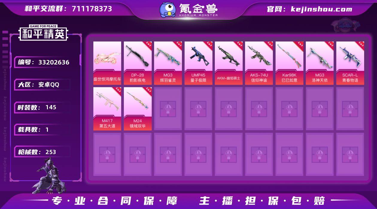 2红装 7粉装 13粉枪 1载具 145套装 253枪皮 盛世惊鸿摩托车 M24-镜域双华(3级) AKM-幽焰骑士(3级) MG3-辉羽雀灵(3级) Kar98K-灵符少年 G36C-镜域双华 S1897-炫彩节奏 Famas-镜域双华 汤姆逊-异彩先驱 DBS-焰鹰斗篷 S12K-幻世战舞者 SCAR-L-青春物语(7级) DP-28-焰鹰斗篷 汤姆逊-耀粉歌者 MG3-镜域双华 S12K-娇憨猪猪 S686-红色方程式 S12K-破晓战魂 AUG-耀粉歌者 S12K-玩趣呆呆 AUG-甜蜜菠萝 野牛-乌木金纹 SPAS-12-田园牧歌 AUG-冰川粉黛 M249-糯团青竹 MP5K-异彩先驱 DP-28-旋转彩虹 AC-VAL-天降萌叽 MP5K-蓝莓炮弹 Mini14-异彩先驱 AC-VAL-乌木金纹 DP-28-齐天大圣 QBZ-洛神天依 蜜獾-天降萌叽 蜜獾-娇憨猪猪 MG3-第五大道 MG3-暗夜行者 AKM-灼热熔岩 M24-炫彩节奏 M24-乌木金纹 AUG-天降萌叽 S1897-星夜魔法师 QBZ-彩虹符号 莫辛纳甘-乌木金纹 AMR-妙红点点 AMR-乌木金纹 M200-惊鸿侠骨 UZI-啾咪啾咪 UMP45-夜灯 VSS-田园牧歌 VSS-彩虹符号 AKM-生命誓言 G36C-乌木金纹 UZI-炫彩节奏 Mk14-乌木金纹 SLR-娇憨猪猪 AWM-焰鹰斗篷 SCAR-L-龙宫之主 Vector-焰鹰斗篷 M417-第五大道(1级) SCAR-L-青丘仙客 MP5K-乌木金纹 UZI-天降萌叽 M249-破晓战魂 G36C-炙焰牛王 DBS-第五大道...