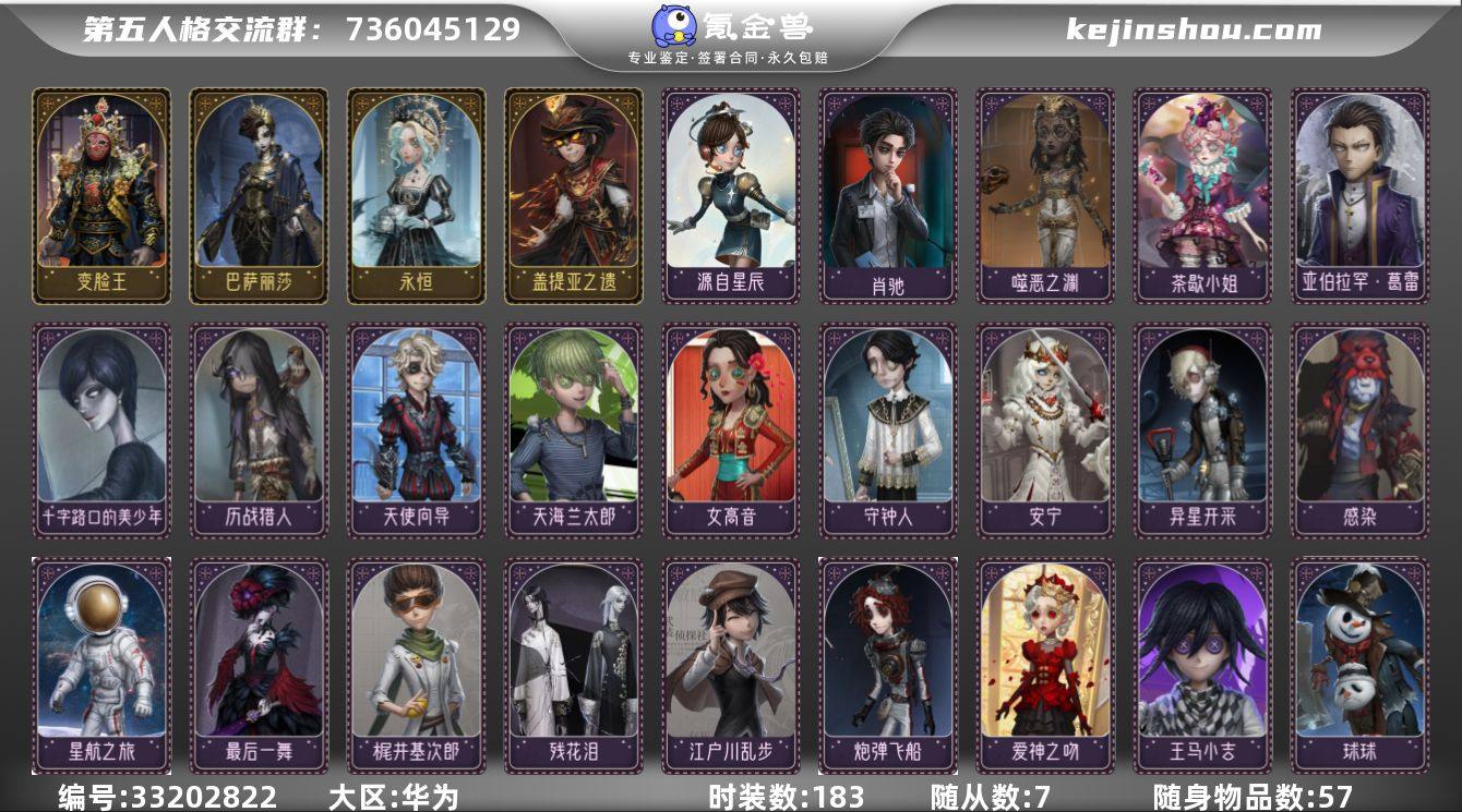 账号类型: 手机账号 时装数: 183 时装: 红夫人-最后一舞,画家-江户川乱步,击球手-迫降专家,勘探员-迷途诗人,昆虫学者-生态圈,哭泣小丑-炮弹飞船,哭泣小丑-蚕食者,盲女-甜心蛋糕,破轮-球球,入殓师-守钟人,宿伞之魂-十字路口的美少年,宿伞之魂-残花泪,宿伞之魂-阴阳司公,守墓人-异星开采,调酒师-女高音,玩具商-线控信号,小丑-变脸王,先知-历战猎人,佣兵-感染,佣兵-白鹰之舞,渔女-迷迭香,杂技演员-梶井基次郎,记者-永恒,摄影师-安宁,空军-爱神之吻,歌剧演员-巴萨丽莎,“囚徒”-天海兰太郎,病患-天使向导,律师-亚伯拉罕·葛雷,心理学家-神圣阿斯莫,幸运儿-星航之旅,杂技演员-王马小吉,勘探员-盖提亚之遗,机械师-纸心,气象学家-茶歇小姐,咒术师-噬恶之渊,小说家-肖驰,园丁-源自星辰