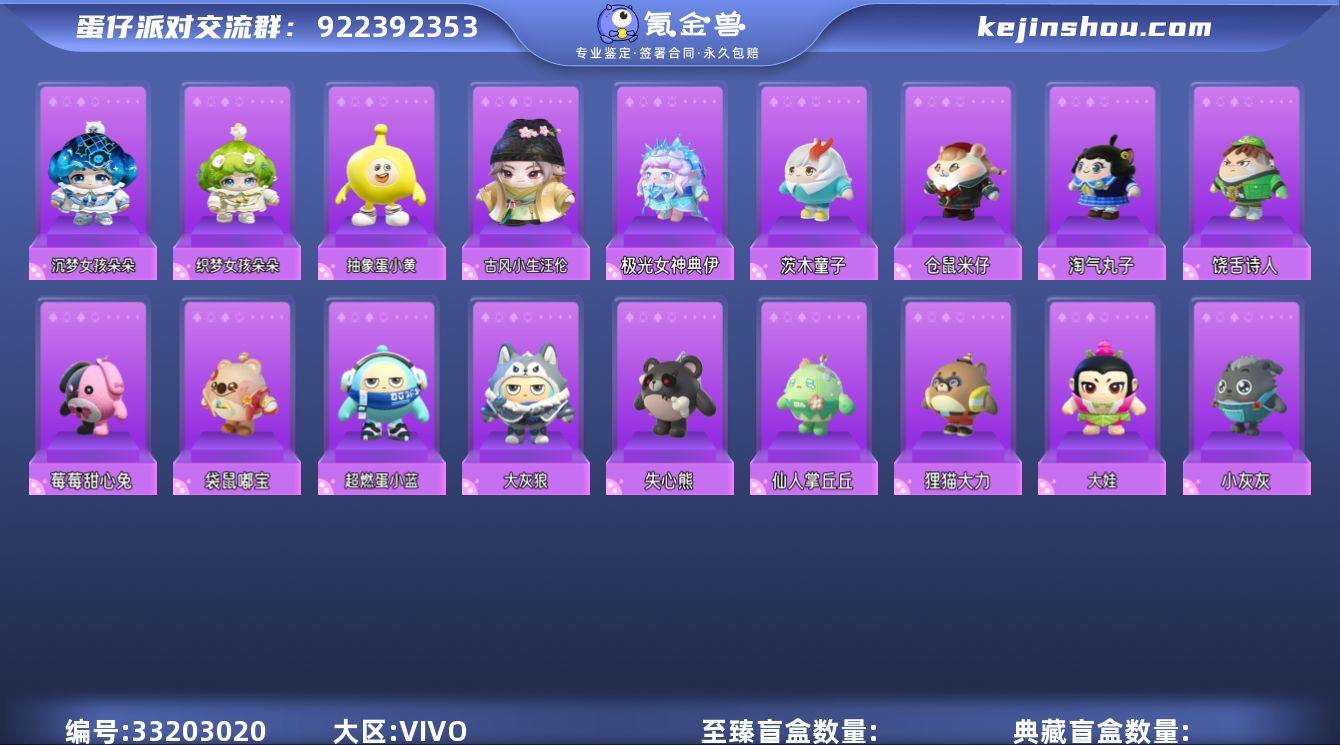 沉梦女孩朵朵,织梦女孩朵朵,抽象蛋小黄,古风小生汪伦,极光女神典伊,茨木童子,超燃蛋小蓝,仓鼠米仔,大娃,大灰狼,袋鼠嘟宝,狸猫大力,莓莓甜心兔,饶舌诗人,失心熊,淘气丸子,小灰灰,仙人掌丘丘 段位:超级凤凰蛋