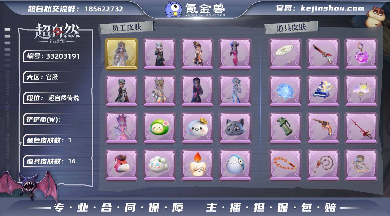 金皮1紫皮8 皮肤:薇薇安-圣光之谕,阿念-灵昭鹿鸣,阿念-庆宴绮愿,艾伦-黎明猎手,爱德华-梵卓之礼,爱丽丝-丝缕哀歌,莉莉-情公主,爱丽丝-耀眼的你,巫铃儿-素影瑶光; 道具:转轮手枪-新星时代,长鞭-新春炸响,闪光弹-邪恶滚滚猫,桃木剑-绯色遗证,短管猎枪-安魂曲,腰包-宝剑八,长鞭-小狗蛇点点鞭,音响-月光奏鸣曲,闪光弹-金戈玄铜,急救包-蔷薇物语,折扇-赴此良宵,伞-郁金春信,除颤仪-冰晶般的代价,音响-happy猫,腰包-红运福虎,长鞭-缚誓之锁; 美妆:美妆-萌兔气泡; 饰品:头饰-哈士奇头套,头饰-惊魂南瓜头套,头饰-卑微头套,头饰-面具马头套,头饰-萨卡班甲鱼头套,头饰-驼半仙头套,头饰-马上有钱,头饰-太空鲨头套,头饰-呆滞头套,头饰-青团糯糯,头饰-饺饺者头套,头饰-炙热烧烤,头饰-煤球喵头套,头饰-蒜了八,头饰-嘻嘻头套,头饰-烛光纪念,头饰-芝麻糊汤圆,头饰-鱼头怪头套,头饰-滑稽头套,头饰-烈焰红唇头套,头饰-小财神豚豚头套,头饰-像素朋克墨镜,头饰-粽小宝头套,头饰-后室幸存者头套 ,挂饰-拂云仙,挂饰-糖果守卫,挂饰-桂冠聆诗,挂饰-钗头凤,挂饰-未竟乐园,挂饰-小鲨包包 ,背饰-牛啤背包,背饰-白鼬趴趴,背饰-晚安仪式;...