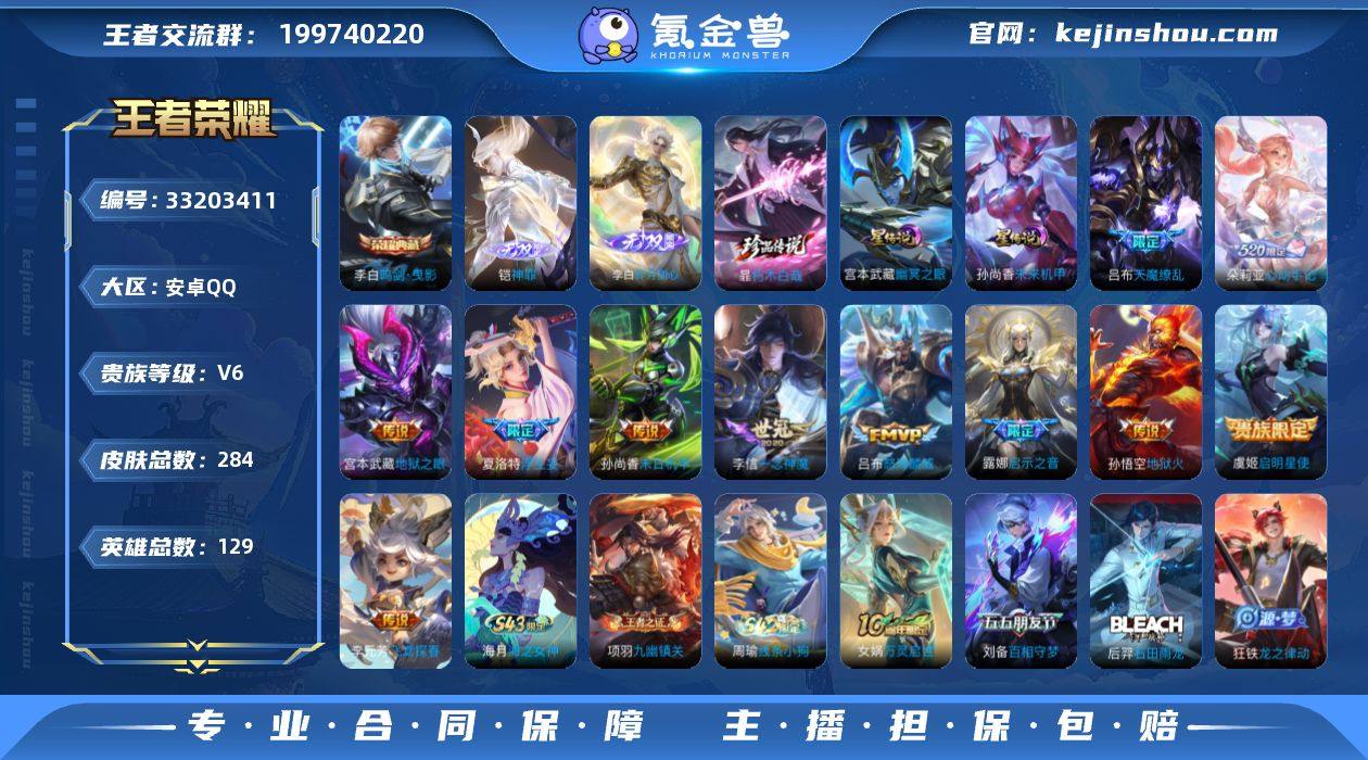【WZYH1132】贵族等级6/荣耀典藏数量1/传说皮肤数量11/史诗皮肤数量66/皮肤数量284/英雄数量129/段位至尊星耀/敖隐全皮/戈娅全皮/鸣剑·曳影/神罪/碎月剑心/幽冥之眼/未来机甲/朽木白哉/朵莉亚心动手记/浮生妄/怒海麟威/启示之音/飞鸢探春/启明星使/一念神魔/末日机甲-孙尚香/地狱之眼/地狱火/天魔缭乱/狰(s8)/天穹之誓(s36)/阴阳师/凯尔特女王(s7)/皇家上将/神迹守卫-墨子/优雅恋人/蜃楼王(s4)/高山流水/死亡摇滚/超时空战士-钟无艳/妖精王(s5)/炼金王(s6)/奇幻香踪/重明(s11)/赤莲之焰/云间偶戏/朔风刀(s17)/落雪兰心/烛龙(s10)/穷奇(s12)/山海·玄木吟/魔术师/万华元夜(s22)/沙漠行僧(s26)/海滩派对/醍醐杖(s20)/航海奇遇记/冰锋战神/演武夺筹(s23)/逐梦之影/驯魔猎人/金庭之子(s27)/潮玩骑士王/至尊宝/御旌(s15)/圣弓游侠/百相守梦(刘备)/银河之约/云中旅人(s29)/驱傩正仪(s24)/潮玩骑兵/真爱魔法/黎明之约/饕餮(s9)/原初探秘者(s21)/五谷丰年/千军破阵(s25)/原初追遂者/混沌棋(s18)/星空之诺/大漠名商(s28)/疑决卦(s19)/李小龙/擒涛扼浪(s31)/御狮(s13)/御霄(s14)/御銮(s16)/猪悟能/暖冬·兔眠/玲珑珍味/探海日志(s32)/海盐诗旅(s30)/星界游侠/驭风魔法/女武神/古海寻踪(s33...