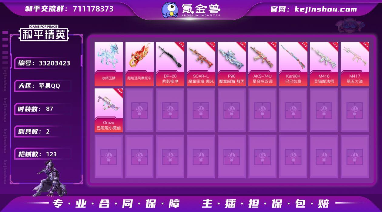 4粉装 10粉枪 2载具 87套装 123枪皮 冰绡玉鳞 踏焰逐风摩托车 M416-灵猫魔法师(3级) GROZA-影袭 汤姆逊-甜梦小狐 Kar98K-影袭 S12K-娇憨猪猪 AUG-甜蜜菠萝 DBS-甜心亚梦 野牛-乌木金纹 M24-影袭 SPAS-12-田园牧歌 Mk47-妙红点点 M249-糯团青竹 DP-28-甜心亚梦 DP-28-乌木金纹 AC-VAL-甜心亚梦 AC-VAL-乌木金纹 MG3-妙红点点 DP-28-彩虹符号 蜜獾-娇憨猪猪 MG3-第五大道 Kar98K-炫彩节奏 M24-乌木金纹 MG3-甜梦小狐 莫辛纳甘-乌木金纹 S1897-乌木金纹 AMR-乌木金纹 AKM-影袭 VSS-田园牧歌 G36C-乌木金纹 Mk14-乌木金纹 UZI-影袭 SLR-娇憨猪猪 M417-第五大道(1级) DBS-第五大道 AKM-破晓战魂 VSS-乌木金纹 蜜獾-千面幻镜 Vector-生命誓言 Vector-田园牧歌 汤姆逊-天降萌叽 M249-乌木金纹 SKS-炫彩节奏 Kar98K-梦幻火箭 P90-乌木金纹 M16A4-甜心亚梦 GROZA-巴啦啦小魔仙(6级) Kar98K-巳巳如意(4级) AKS-74U-星穹咏叹调(7级) DP-28-豹影疾电(5级) P90-魔童闹海 敖丙 SCAR-L-魔童闹海 哪吒 千面幻镜飞行器 梦幻火箭飞行器 灵猫魔法师飞行器 炫彩糖果飞行器 灵珠游龙飞行器 飞天猪飞行器 节奏起飞飞行器