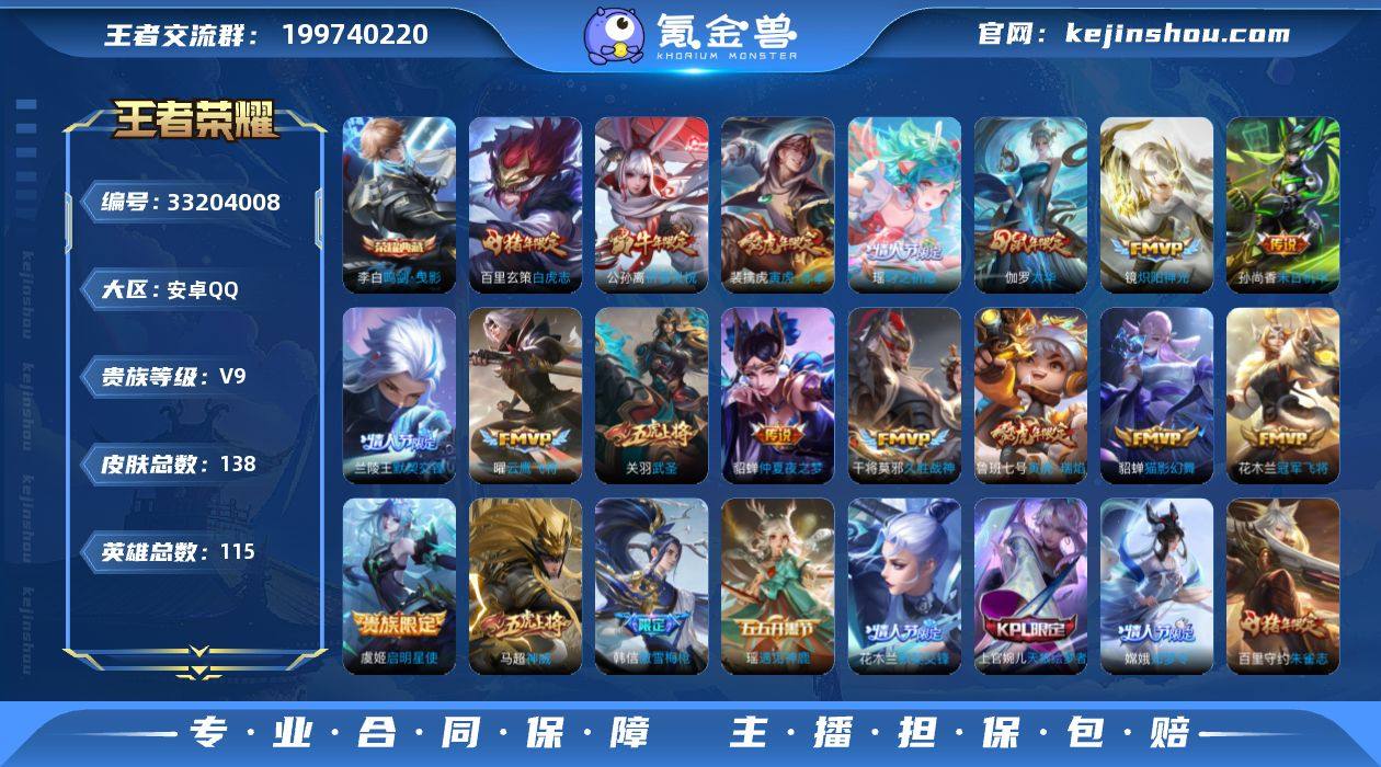 实名: 可修改 性别: 女号 贵族等级: V9 英雄数: 115 皮肤数: 138 荣耀水晶: 鸣剑·曳影 传说皮: 冠军飞将,云鹰飞将,猫影幻舞,久胜战神,炽阳神光,末日机甲-孙尚香,仲夏夜之梦 限定皮: 李小龙,祈雪灵祝,武圣,神威,时之彼端,奇迹圣诞,太华,天狼运算者,神奇女侠,天狼绘梦者,寅虎·御盾,白虎志,瑞麟志,玄武志,朱雀志,如梦令-嫦娥,默契交锋-兰陵王,如梦令-后羿,默契交锋-花木兰,寅虎·瑞焰,高山流水,匿光追影者,傲雪梅枪,寅虎·赤拳,寅虎·心曲,寅虎·展翼,时之祈愿-云中君,时之祈愿-瑶,百木心枪 亮点: 【优质装备】:鸣剑·曳影,冠军飞将,云鹰飞将(小将军),猫影幻舞,久胜战神,炽阳神光,末日机甲-孙尚香(绿蚂蚱),仲夏夜之梦(大飞蛾)