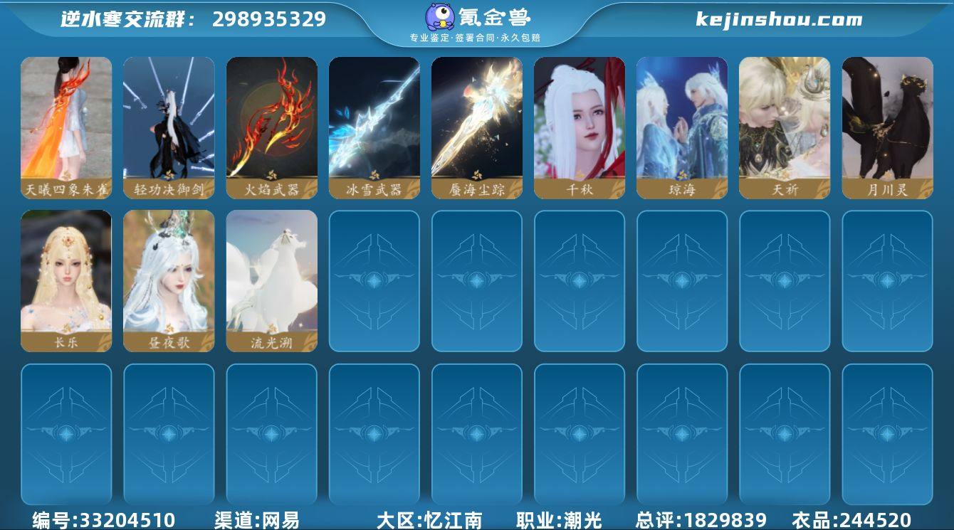 【区服】 西子湖畔 【充值称号】 把酒临风 【已用天赏石】 24 【天霓染数量】 2 【天霓染】 晴岸涛吟*1, 陆离*1 【稀有道具】 浑天劫 【天赏发型】 铆月寒, 长乐, 昼夜歌, 天祈, 琼海, 千秋 【天赏祥瑞】 月川灵, 流光溯 【天赏外观】 冰雪武器, 火焰武器, 雷霆武器, 水武器, 海市蜃楼武器, 轻功诀御剑, 天曦四象·朱雀 【天赏灵宠】 灵宠·天狼星 【副本外观】 白夜拂雪*1, 星剑分野 【配饰】 冷香缭岚, 犯逆鳞 【商城外观】 千星咏叹, 雾蓝星瞳, 玄喵夜行, 幻核星芒, 甜宙漫游, 夜雪闻梅, 悠影掠风, 玉华拈香, 云梦萤星, 紫渊龙堂, 云极天穹, 白凤御羽, 拂新柳, 归墟化神, 司玄镇天, 天离渊青, 海月漫歌, 朝歌旧梦, 诗剑纵歌, 灵珠海羽, 跃动心芒, 朔雪从风, 灼金喵影, 福禄金刚, 灵语星彩, 闻鹤九皋, 晴蓝逸思, 凤亭骁野, 晴岸涛吟, 云汉逢夕, 不负卿愿, 修罗焚天, 白露惑心, 星宫遐音, 贪狼摄星, 开阳执戈, 逆鳞浊日, 火鸾鸿衣, 金祷颂晖, 玉泽凌烟, 金粉绮梦, 烽火浮生, 赤狐魅语, 圣月沉夜, 醉墨狂歌, 天纵恒尊, 林泽仙踪, 瀚雪冰封, 白灵幻尘, 灵鹿苍风, 舞乐浮烬, 墨隐千秋, 枫华九霄, 极夜天曦, 御宇临渊, 青瓷映月 【祥瑞坐骑】 纵风甲车·赤, 布丁, 飞鸭, 风行·江湖景...
