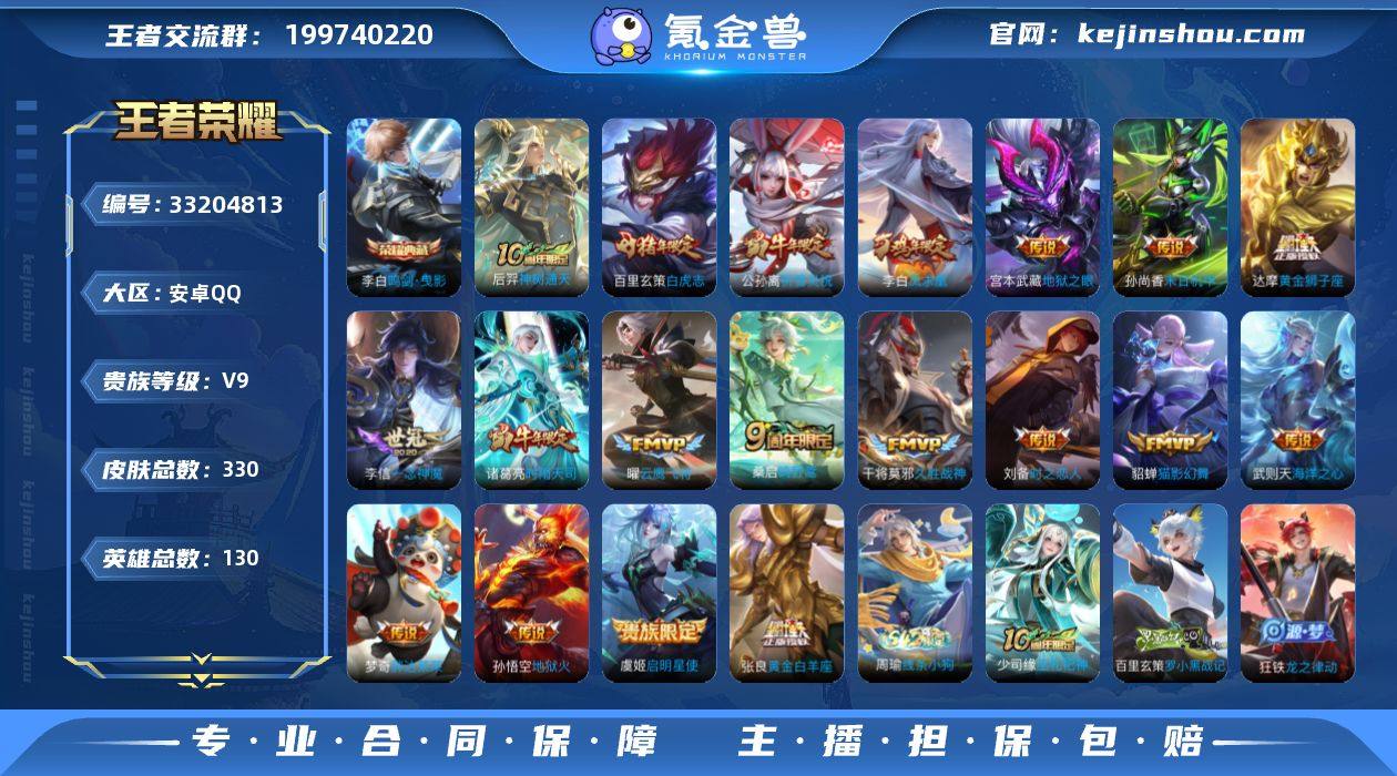 安卓Q-V9-最强王者段位-130英雄-330皮肤-1典藏皮肤-1典藏英雄-19传说-88史诗 【英雄全皮】:孙权全皮,敖隐全皮 【荣耀典藏】:武则天英雄,李白鸣剑曳影 【传说皮肤】:后羿神树通天,桑启鸣野蒿,公孙离祈雪灵祝,诸葛亮时雨天司,虞姬启明星使,曜云鹰飞将,李信一念神魔,刘备时之恋人,貂蝉猫影幻舞,张良黄金白羊座,干将莫邪久胜战神,达摩黄金狮子座,百里玄策白虎志,梦奇胖达荣荣,李白凤求凰,孙尚香末日机甲,宫本武藏地狱之眼,孙悟空地狱火,武则天海洋之心 【限定皮肤】:白起狰,姜子牙天穹之誓,狄仁杰阴阳师,虞姬凯尔特女王,赵云皇家上将,赵云引擎之心,墨子神迹守卫,妲己时之彼端,庄周高山流水,高渐离玩趣恶龙,钟无艳超时空战士,孙膑妖精王,扁鹊炼金王,芈月重明,芈月白晶晶,芈月幻夜卜梦,吕布猎兽之王,元歌云间偶戏,元歌无心,夏侯惇朔风刀,甄姬落雪兰心,曹操烛龙,典韦穷奇,马可波罗山海玄木吟,狄仁杰魔术师,狄仁杰万华元夜,达摩星际陆战队,达摩沙漠行僧,项羽海滩派对,项羽霸王别姬,老夫子醍醐杖,老夫子航海奇遇记,关羽冰锋战神,程咬金演武夺筹,韩信飞衡,韩信傲雪梅枪,兰陵王金庭之子,亚瑟潮玩骑士王,牛魔御旌,后羿辉...