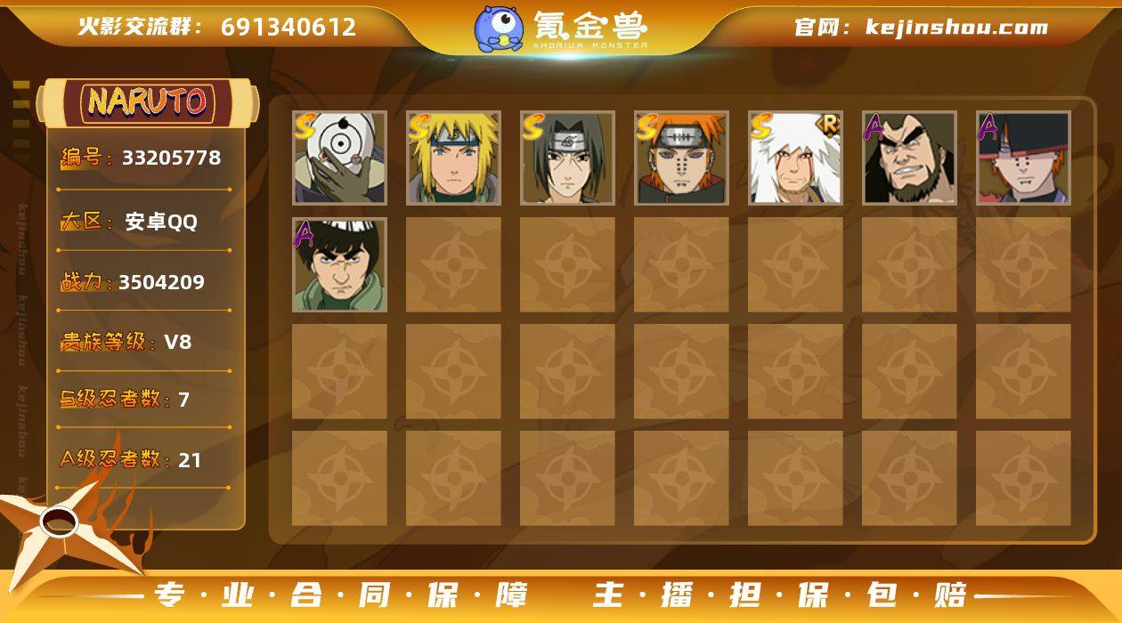 安卓QQ/极品新手入坑首选极品小号/198忍者两个/S忍者数:7- A忍者数:21/【S级忍者】宇智波斑「秽土转生·解」(3星),宇智波斑「白面具」(3星),自来也「舞之豪杰」(3星),宇智波鼬「须佐能乎」(3星),漩涡鸣人·宇智波佐助(3星),佩恩「天道」(3星),波风水门(3星),【A级忍者】宇智波佐助「须佐能乎」(2星),旗木卡卡西「幻之真容」(2星),李洛克「忍界大战」(2星),蝎「绯流琥」(2星),秋 道丁次「忍界大战」(2星),宇智波泉奈(2星),神农「羁绊」(2星),春野樱「百豪」(2星),干柿鬼鲛(2星),猿飞阿斯玛(2星),迈特凯(2星),蝎(2星),飞段(2星),飞段「死司凭血」(2星),波风水门「青年」(2星),佩恩·六道「漂泊浪客」(2星),日向宁次「忍界大战」(2星),神秘面具男「忍者之路」(2星),漩涡博人「桃式显现」(2星),迈特凯「青春爆炸」(2星),机械鸣人「初始形态」(2星),