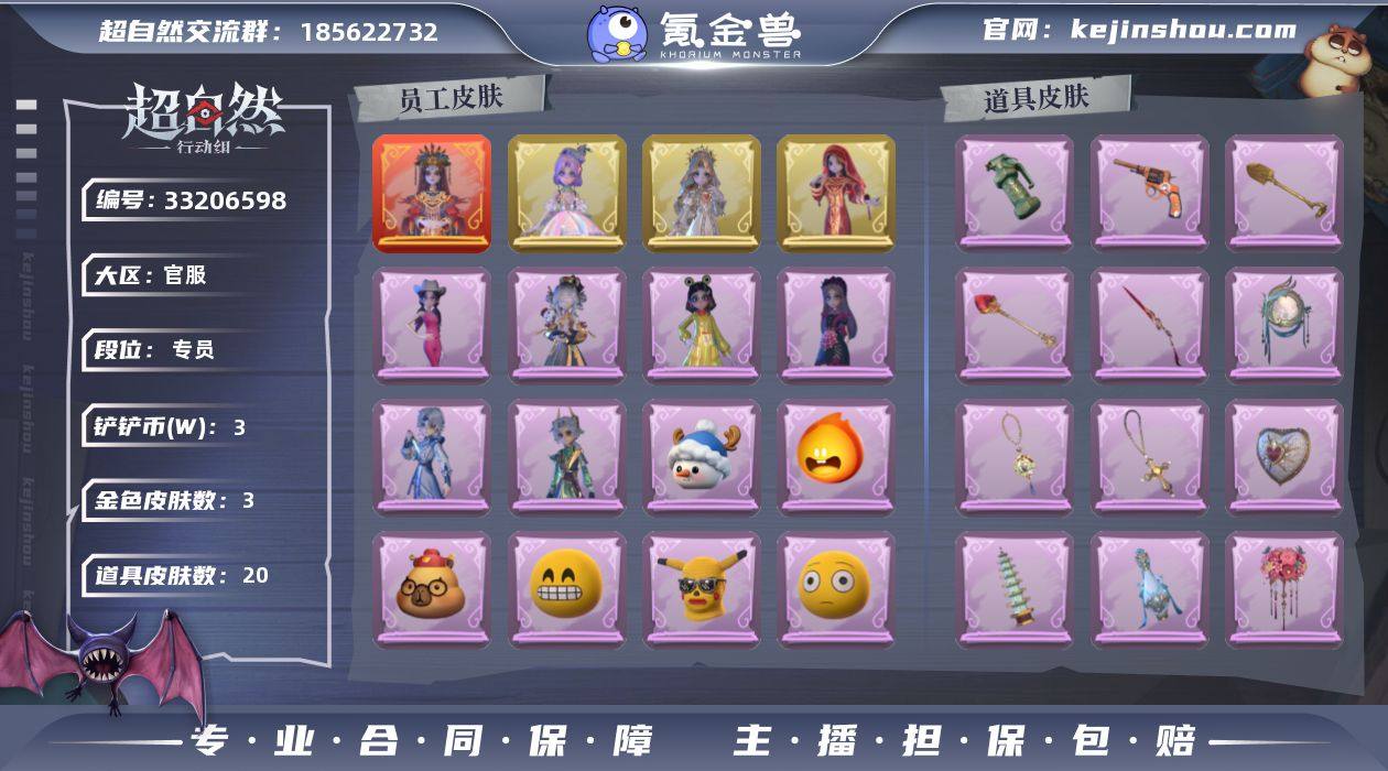ZR818,红皮:1,金皮:3,紫皮:6,道具皮:20,外观:巫铃儿-镜生遗梦,薇薇安-圣光之谕,小黄-遗失的童话,巫铃儿-镜花辞,爱丽丝-耀眼的你,莉莉-除妖小师妹,逍遥-泽引山海,零-青云逸歌,爱丽丝-丝缕哀歌,小黄-呱呱雨衣,道具:音响-鸣沙鼓,铲子-龙鳞,腰包-宝剑八,荧光棒-桃心,额外的背包-飞花令,桃木剑-凤鸣九天,摸金符-紫霄,音响-happy猫,夜视仪-金丝眼镜,摸金符-祝祷词,急救包-蔷薇物语,传送按钮-昆仑镜,铲子-圣心之泪,转轮手枪-新星时代,闪光弹-金戈玄铜,黄牛能量饮料-青玉抱丹,葫芦-伏妖塔,背饰-牛啤背包,背饰-天使的呼唤,背饰-蝶恋花,员工:小黄,爱丽丝,零,阿念,逍遥,薇薇安,巫铃儿,莉莉,艾伦,爱德华,兰,小满,临云,动作:新年摇,企鹅舞,luvaboy,鹏友摇,心跳摇,小雨摇,舞台中心,举牌,抬手,旋转舞,失落,头饰:太空鲨头套,雪墩墩头套,小财神豚豚头套,鱼头怪头套,烈焰红唇头套,大葱明头套,火爆了头套,面具马头套,哈士奇头套,萨卡班甲鱼头套,嘻嘻头套,滑稽头套,呆滞头套,卑微头套,小狗蛇点点头套,炙热烧烤,像素朋克墨镜,后室幸存者头套,挂饰:孤独对望,小鲨包包,天使消失的年代,钗头凤,糖果守卫,主页装扮:虚镜回廊,赛季魔盒:普通魔盒,累充:21840金砖,段位:专员,铲铲币:3w