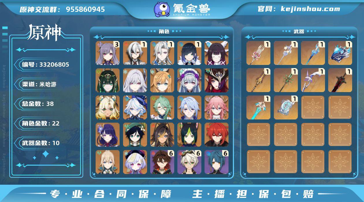 38黄! 冒险等级: 60 3命金色角色: 三命刻晴 1命金色角色: 一命夜兰,一命那维莱特,一命阿蕾奇诺 0命金色角色: 迪卢克,温迪,七七,琴,雷电将军,八重神子,神里绫人,提纳里,迪希雅,白术,芙宁娜,希诺宁,恰斯卡,梦见月瑞希,爱可菲,丝柯克,奈芙尔,哥伦比娅 拥有武器: 狼的末路,四风原典,和璞鸢,阿莫斯之弓,天空之刃,赤沙之杖,万世流涌大典,静水流涌之辉,柔灯挽歌,香韵奏者 1精武器: 狼的末路,四风原典,和璞鸢,阿莫斯之弓,天空之刃,赤沙之杖,万世流涌大典,静水流涌之辉,柔灯挽歌,香韵奏者 亮点: tap已注销