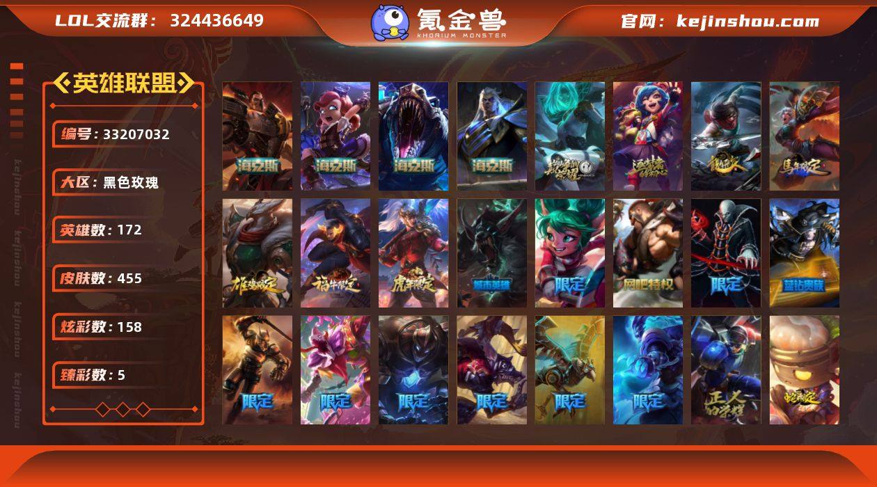【LDC3234】172英雄/455皮肤/7神话/63限定/5臻彩/158炫彩/53传说/113史诗/未定级账号等级:720/觅心游侠卢锡安/10周年 安妮/源代码 乐芙兰/10周年庆典 凤凰/海克斯 安妮/海克斯 斯维因/海克斯 雷克顿/恐惧新星 德莱厄斯/无畏骑士 瑟庄妮 赤子初心/冠军之志 瑞兹 凯旋圣装/玉剑传说 舞剑仙 承影/星之守护者 卡莎 热情之光/花仙子 崔丝塔娜 蓝闪/银龙裁决 泰隆/龙年 孙悟空/替父从军 花木兰/司马懿 仲达/福牛守护者 德莱厄斯/猛虎下山 赵信/点心宝贝 阿木木/甜心宝贝 安妮/幸福女神 乐芙兰/持胡萝卜的雪人 易/圣诞开心鬼 提莫/圣诞精灵 崔丝塔娜/圣诞糖果棒 厄运小姐/圣诞狂欢 时光/“主人不要我了” 阿木木/胡桃夹子 小丑/平安夜女神 娑娜/英勇玩具兵船长/冰雪节 茂凯/冬季仙境 发条/雪默丁格/圣诞老人 酒桶/圣诞驯鹿 克格莫/魄罗骑士 瑟庄妮/雪球也能爆炸 吉格斯/圣诞老人 布隆/银白审判 凯尔/诺斯费拉图 弗拉基米尔/冠军典狱长 锤石/S1FNC 迦娜/S1FNC 库奇/S2 暗杀星 蒙多/S2 暗杀星 努努/S2 暗杀星 慎/S2 暗杀星 伊泽瑞尔/S4 SSW 炼金/S4 SSW 图奇/S4 SSW 泰隆/S4 SSW 雷恩加尔/S5 SKT T1 阿利斯塔/S5 SKT T1 阿兹尔/S5 SKT T1 滑板鞋/S5 SKT T1 瑞兹/S6 SKT T1 奥拉夫/S9 FPX...