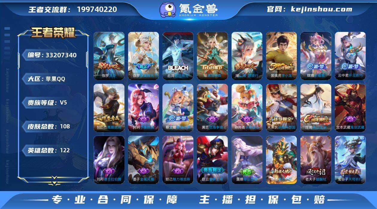 伽罗太华+炽翼辉光 双传说 V5,108皮肤,英雄122,皮肤收集度11300/14000,图鉴等级11,信誉分正常,账号安全无禁言,没违规,和QQ号一起出