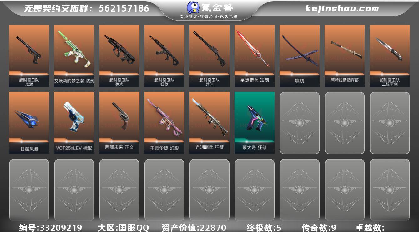 段位: 黄金 套装: 超时空卫队 近战武器皮肤: 镭切-创·纪元,日耀风暴,超时空卫队 三棱军刺,阿特拉斯指挥部,星际猎兵 短剑 步枪皮肤: 幻影-千灵华绽,狂徒-光明哨兵,狂徒-超时空卫队,獠犬-超时空卫队 佩枪皮肤: 标配-VCT25xLEV,正义-西部未来,鬼魅-超时空卫队,蒙太奇 狂怒 狙击枪皮肤: 莽侠-超时空卫队 冲锋枪皮肤: 骇灵-艾沃莉的梦之翼 亮点: 【优质装备】:幻影-千灵华绽,狂徒-光明哨兵,骇灵-艾沃莉的梦之翼,镭切,日耀风暴 遗器,超时空卫队 三棱军刺,阿特拉斯指挥部,星际猎兵 短剑
