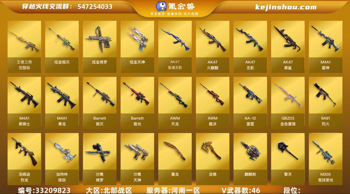 北部战区(河南一区)ys【生化爆破号】46v【M200-竞技荣光,QBZ03-金色蔷薇,6烈龙+死亡之眼,4修罗,Barrett-毁灭套装】1王者【王者之势】5炫金【炫金毁灭,炫金天神,炫金修罗】3角色【葵,王者-零,王者之瞳】3音效【Barrett-毁灭音效卡,AK47-火麒麟音效卡,M4A1-黑骑士音效卡】15皮【黑骑士-耀金,火麒麟-CFSTAR,死神-秘银】 截图展示段位不代表实际段位 如赛季更新等不可抗拒因素发生变化、时限道具不保证所剩时间